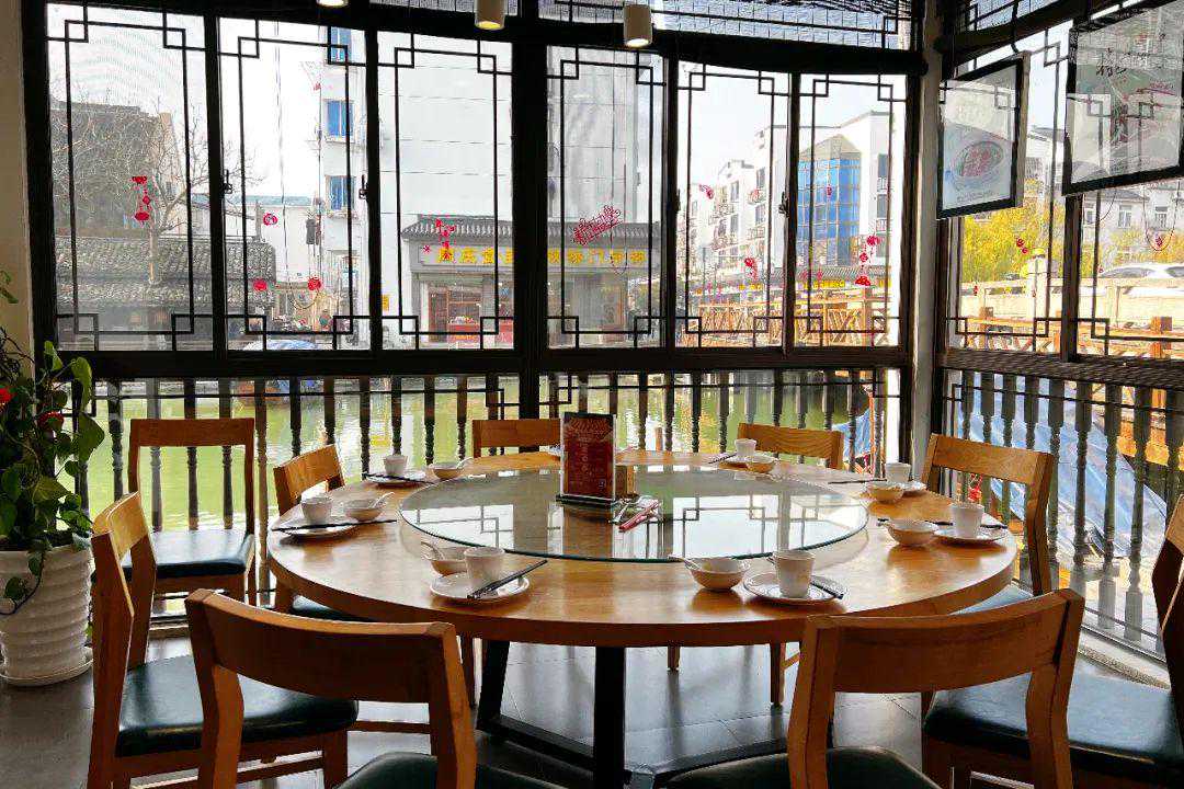 石桥旁,这是一家临河的餐厅,主打创意菜,外观古色古香,在周庄古镇内并不起眼。