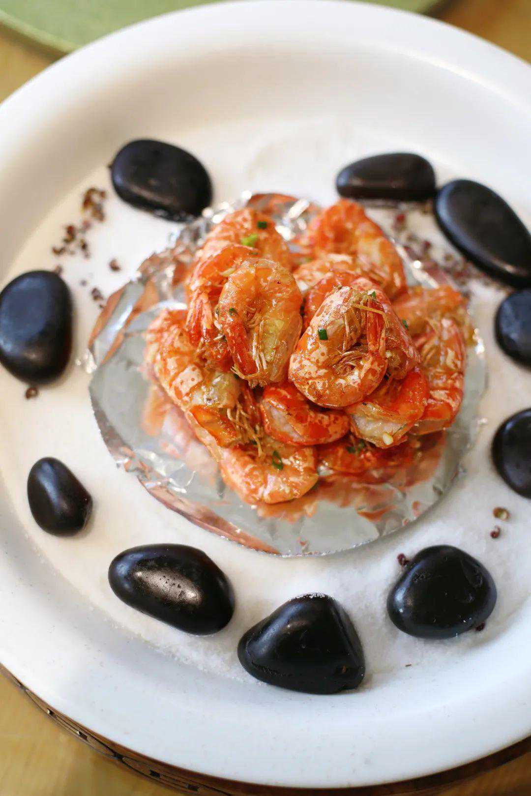 是用白色的盐铺底,上面是一圈黑色的鹅卵石。这道菜端上来,是要点火的,可惜白天火光不明显。