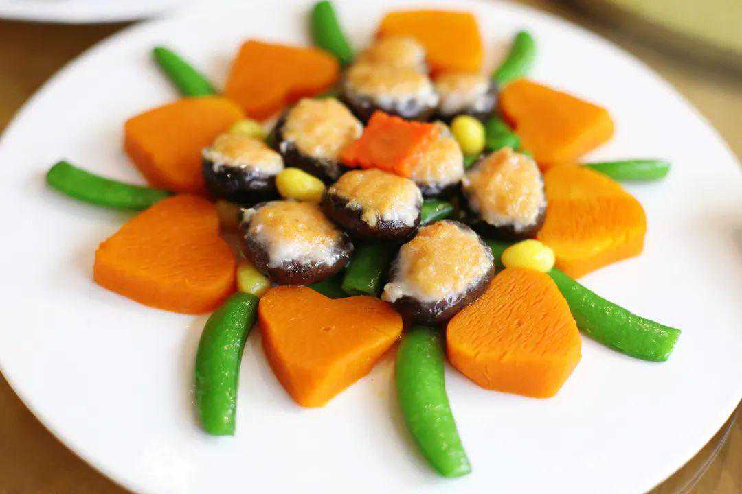 这道菜叫做“花开富贵”,可真像一朵盛开的花啊!那金黄色的是南瓜,居然切成了一颗颗爱心,用心了。