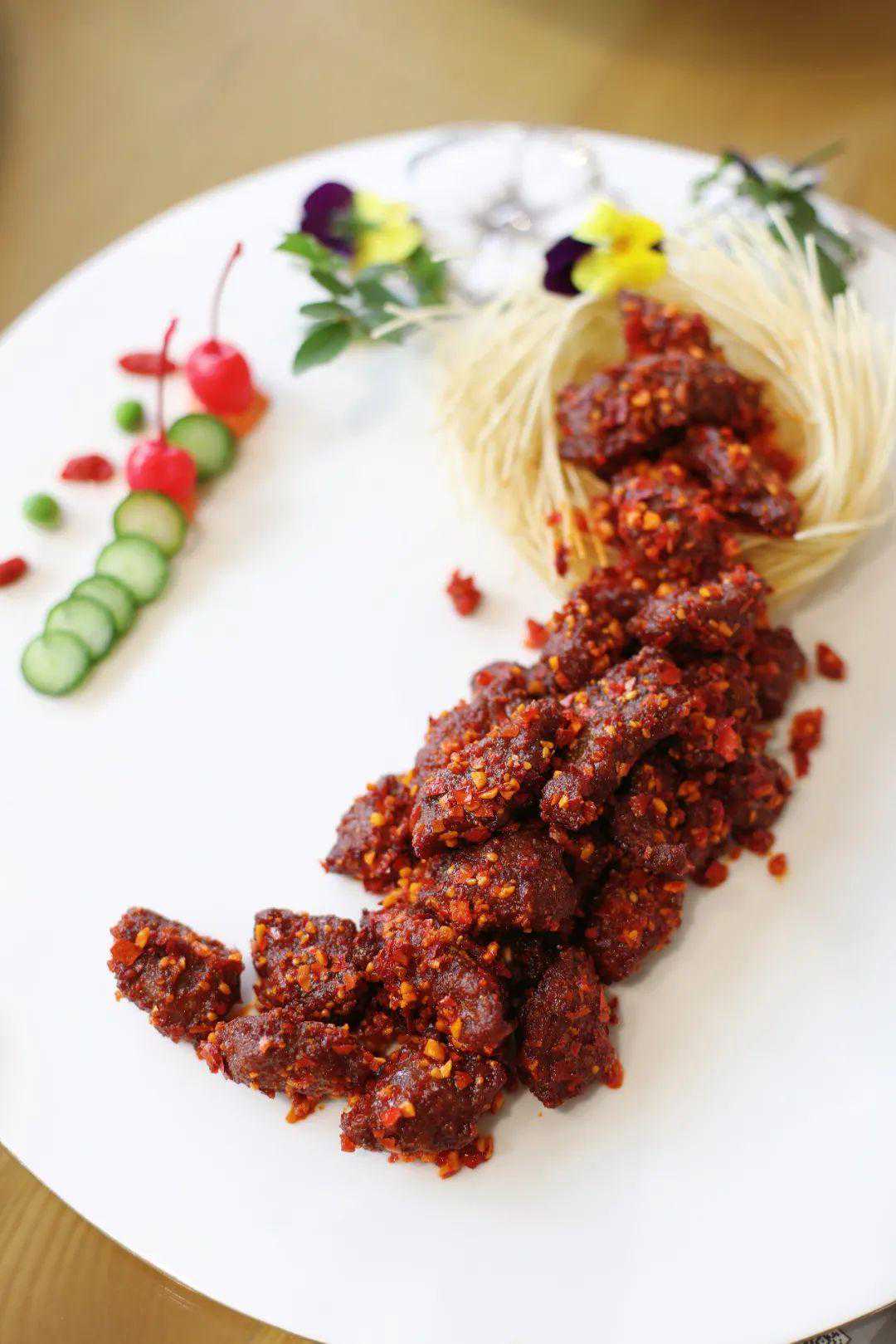 特色牛肉粒。这是唯一一道带辣的菜,因为苏州很多本地人都不吃辣。但这道菜是看着辣,实际一点也不辣。