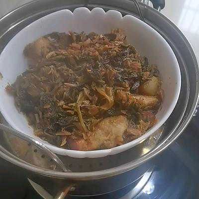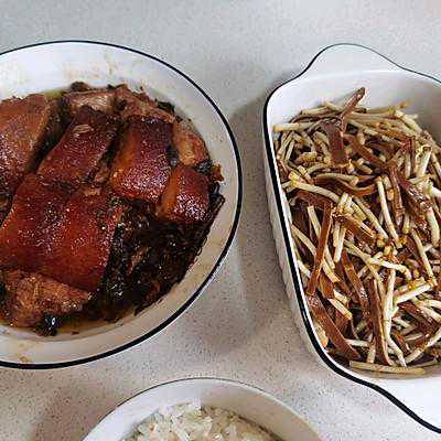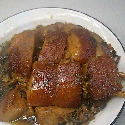 5、分装到小碗,皮朝下,肉上面放少许盐菜,超级下饭的