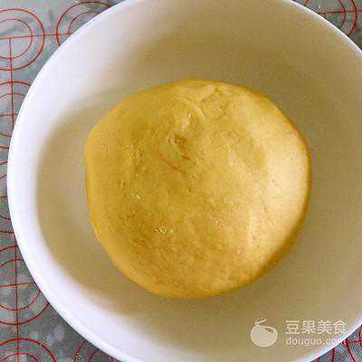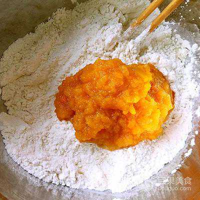 3、黄色面团:将南瓜泥倒入面粉中,加入砂糖,倒入酵母水