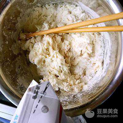 5、白色面团:面粉中倒入酵母水,慢慢注入牛奶,加入砂糖,用筷子调成絮
