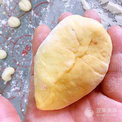 13、将面团按扁,包入奶黄馅