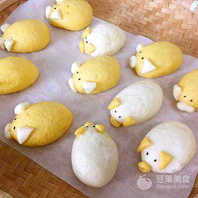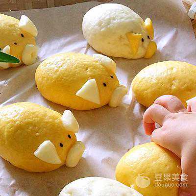 你被它萌化了吗?详细步骤就不写奶黄馅制作步骤了,请参考我发布的菜谱奶黄包做法。这里顺便带过。奶黄馅馅料:黄油50克,砂糖50克,鸡蛋2个,牛奶50克,澄粉50克,吉士粉10克。奶黄馅做法:黄油软化后,加入砂糖拌匀。分三次加入鸡蛋液拌匀,加入牛奶搅拌均匀,筛入面粉搅拌至顺滑无颗粒。上锅蒸15分钟,蒸制期间不停用筷子搅拌均匀,以便完全蒸熟。蒸好后完全冷却,放冷冻20分钟。
