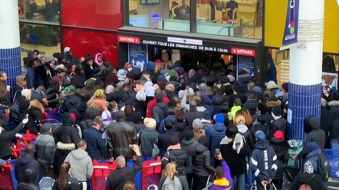 往外出的,低着头看着手里拎着的大兜小袋,惬意的神情,为自己能争抢到这么便宜的货物而心满意足,轻轻松松地走出店门。