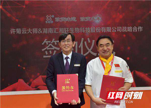 红网时刻9月18(记者邓晓娟)今天,在长沙国际餐饮食品博览会上,中国烹饪大师、湘菜大师许菊云与湖南汇湘轩生物科技有限公司举行合作签约仪式,自此,许菊云大师正式成为汇湘轩的技术总顾问、配方总设计师、形象代言人和产品广告宣传代言人。