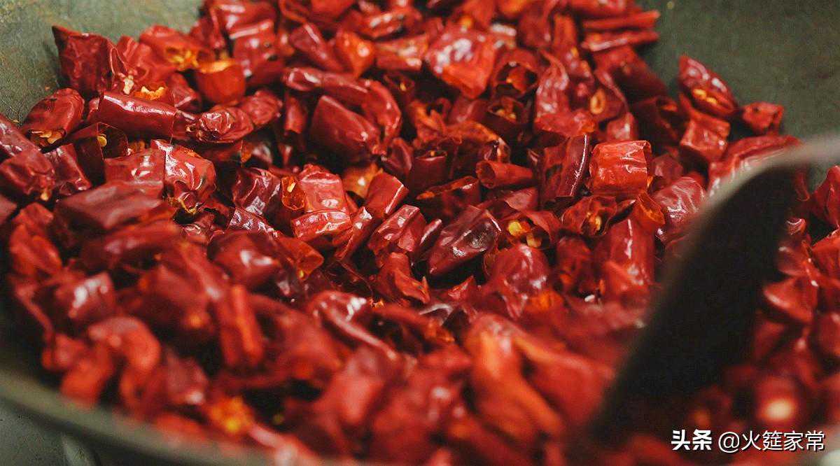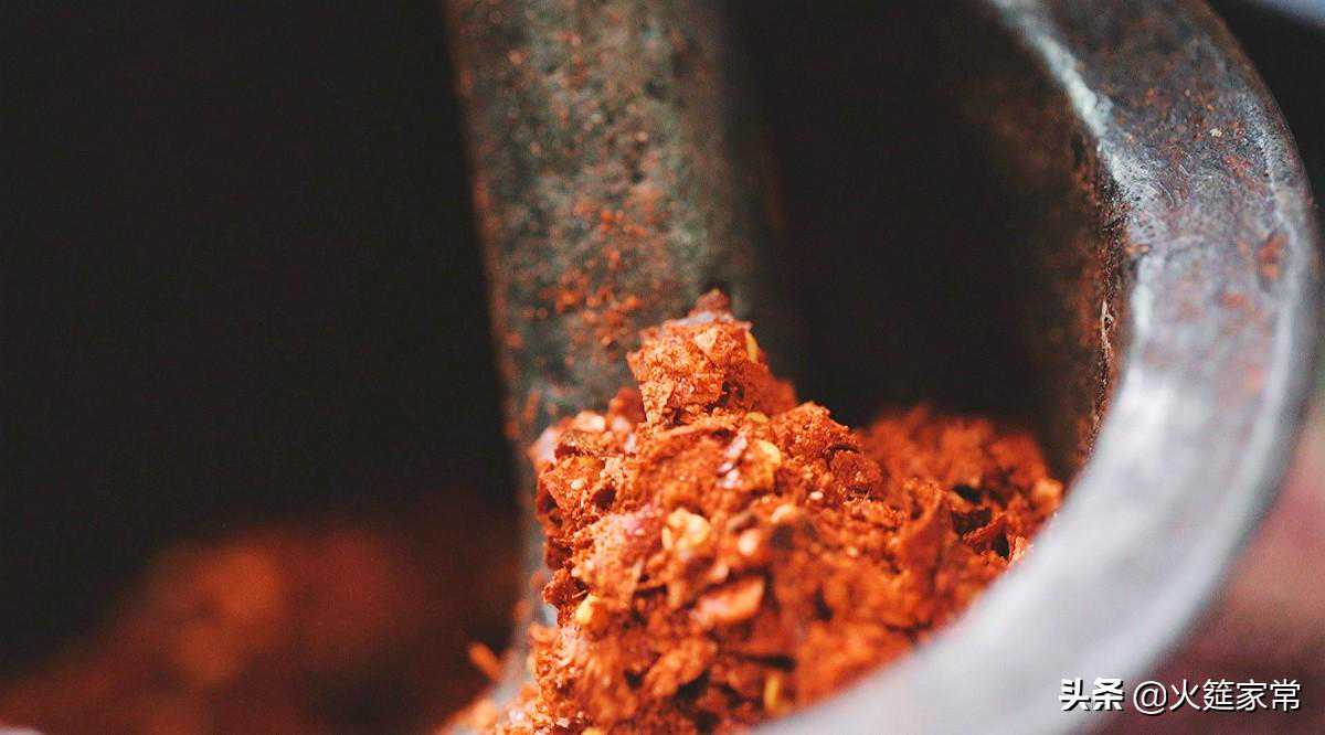 5制作辣椒油,辣椒剪段,炒香后晾凉,再放进磓窝捣碎