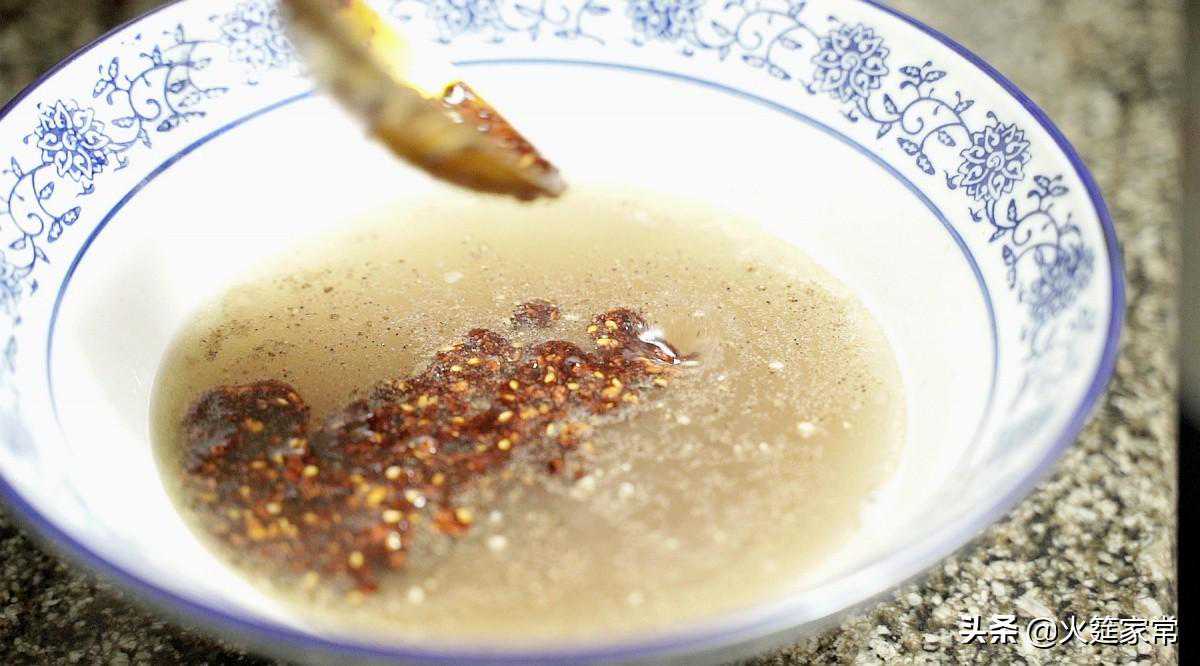 13芹菜切碎,碗底加一勺牛骨汤,再加入适量盐、鸡精、花椒面和辣椒油