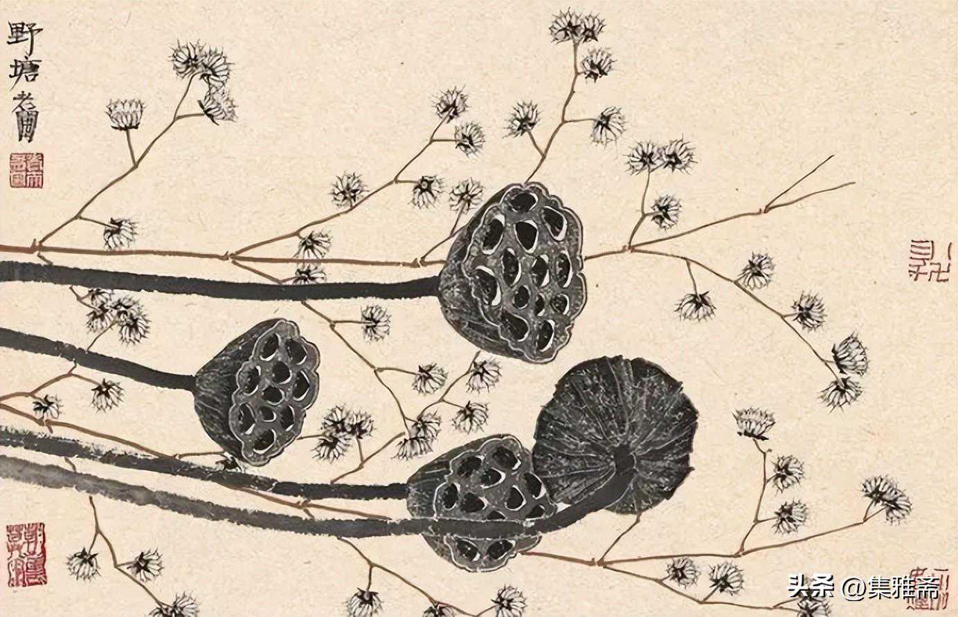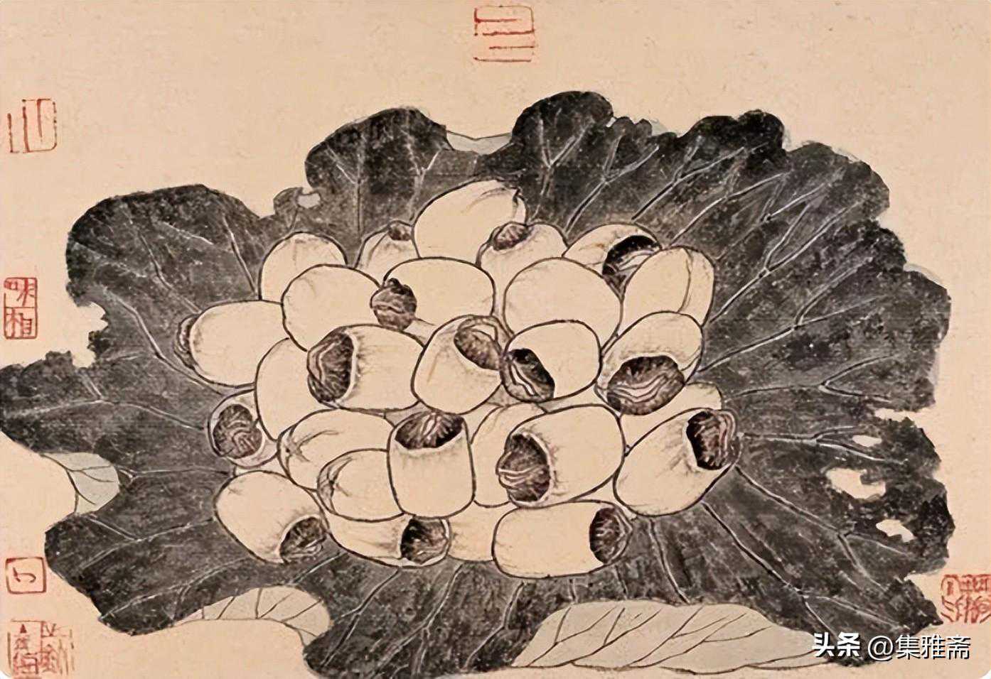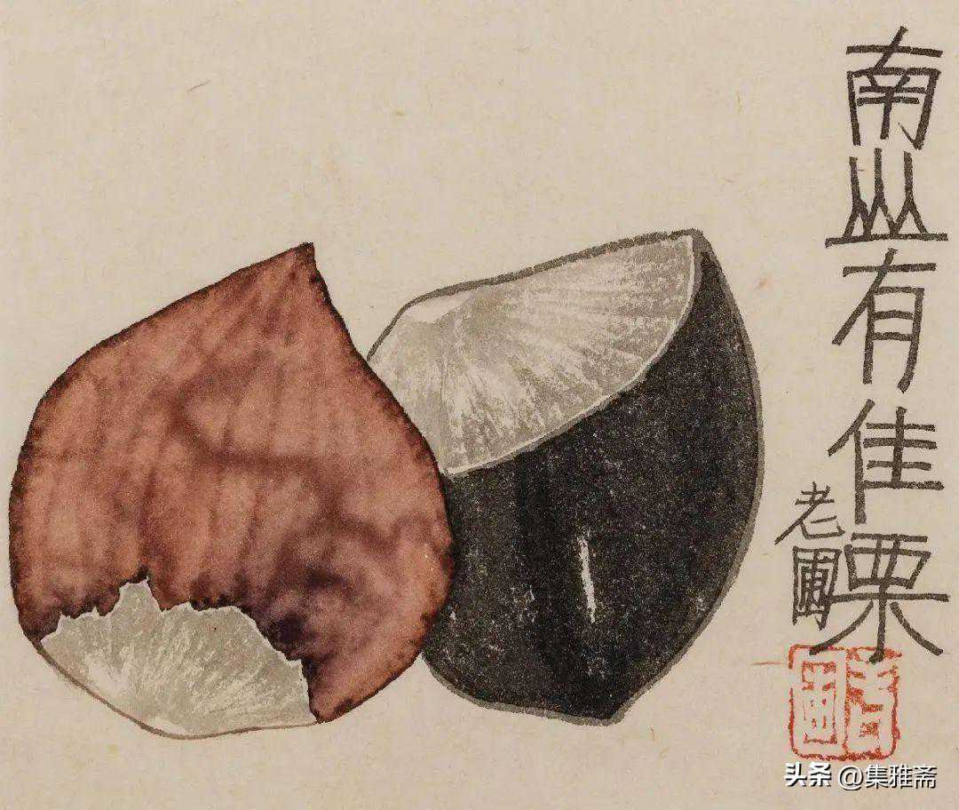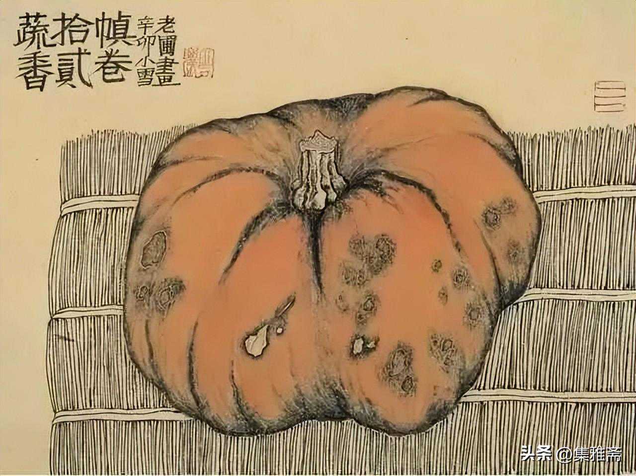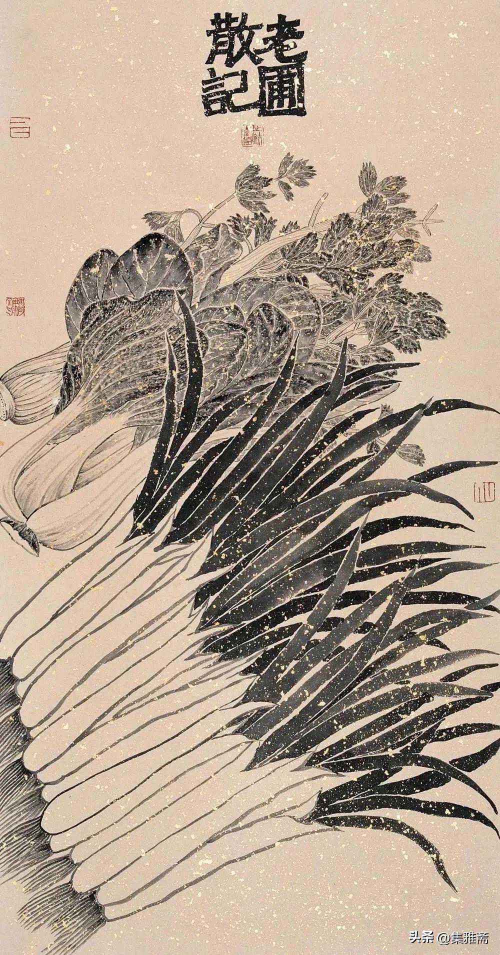 或墨线勾勒,或干笔皴擦,寥寥数笔,生动传神。老圃笔下的蔬果画,既有中国画的传统文脉,又有西方绘画技法的妙用。此外,他创新题款,使之有斧劈刀刻之感。萝卜、莲蓬以圆笔勾勒,题款以方笔仿宋印刷体点缀,方圆结合,逸趣横生。
