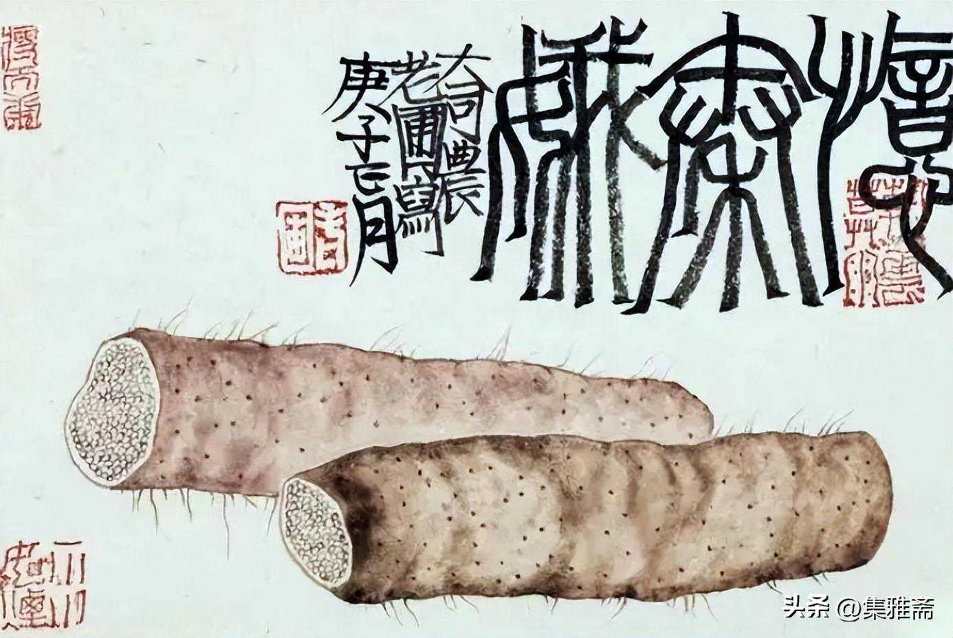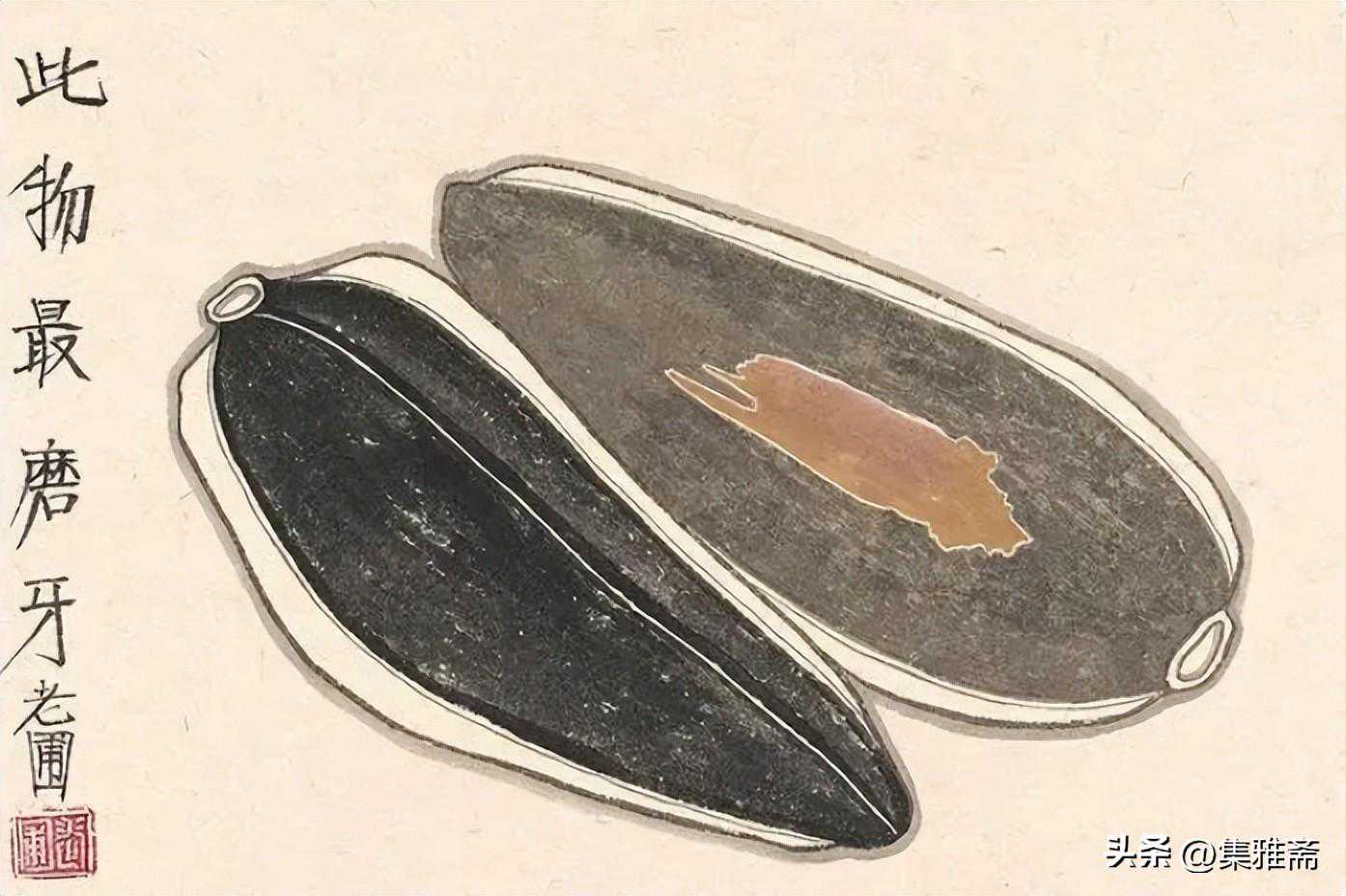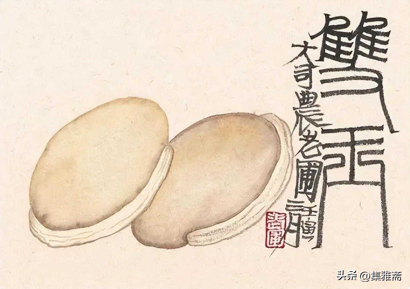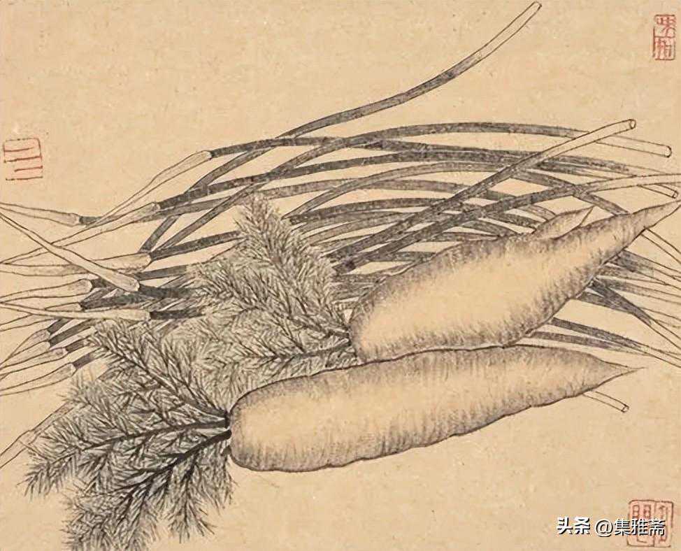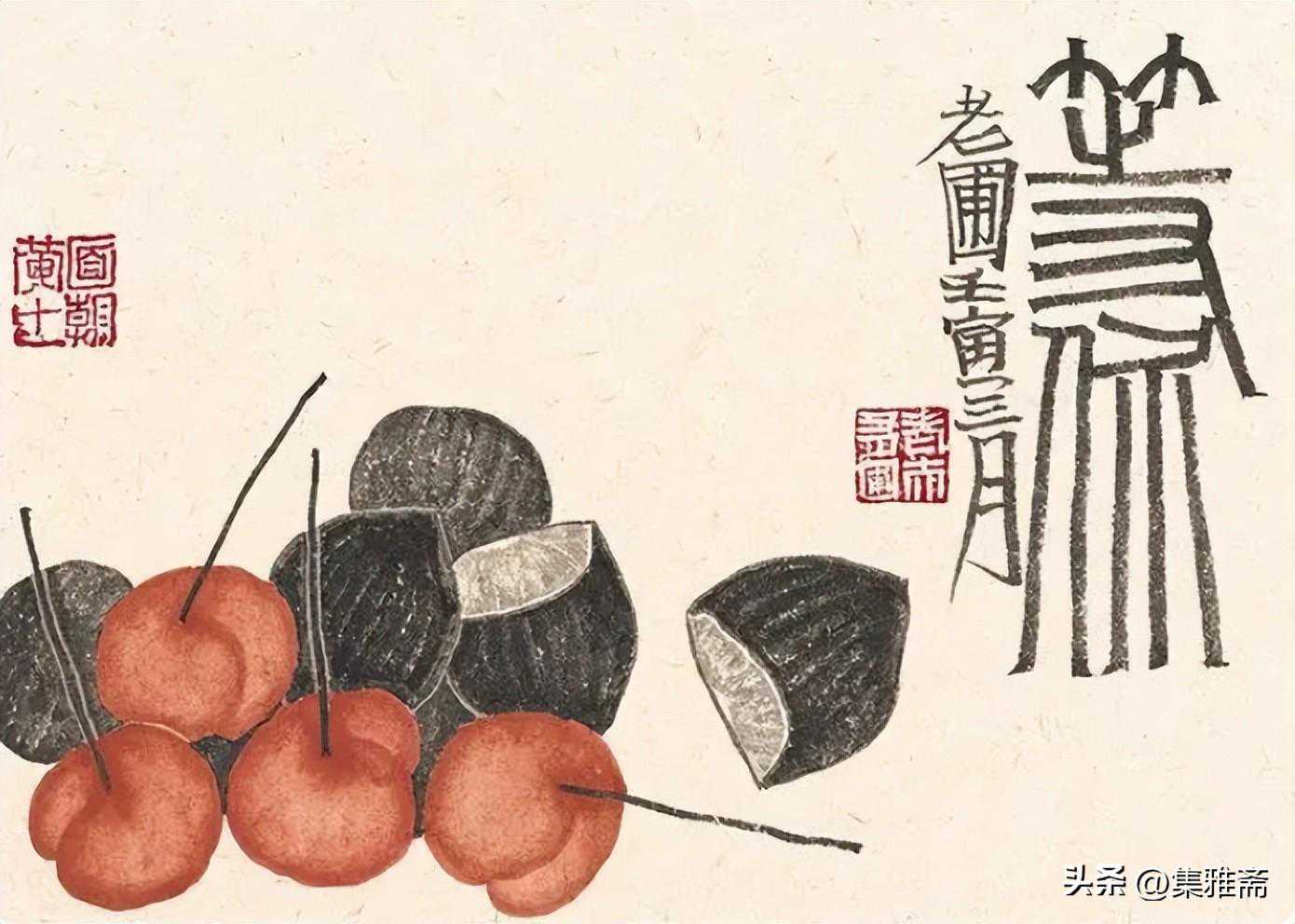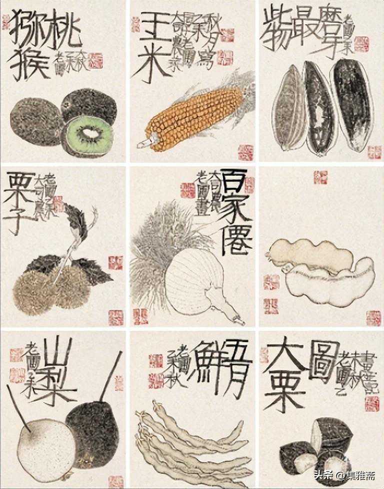 或墨线勾勒,或干笔皴擦,寥寥数笔,生动传神。老圃笔下的蔬果画,既有中国画的传统文脉,又有西方绘画技法的妙用。此外,他创新题款,使之有斧劈刀刻之感。萝卜、莲蓬以圆笔勾勒,题款以方笔仿宋印刷体点缀,方圆结合,逸趣横生。