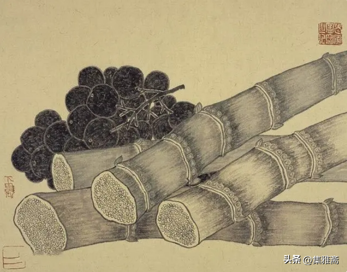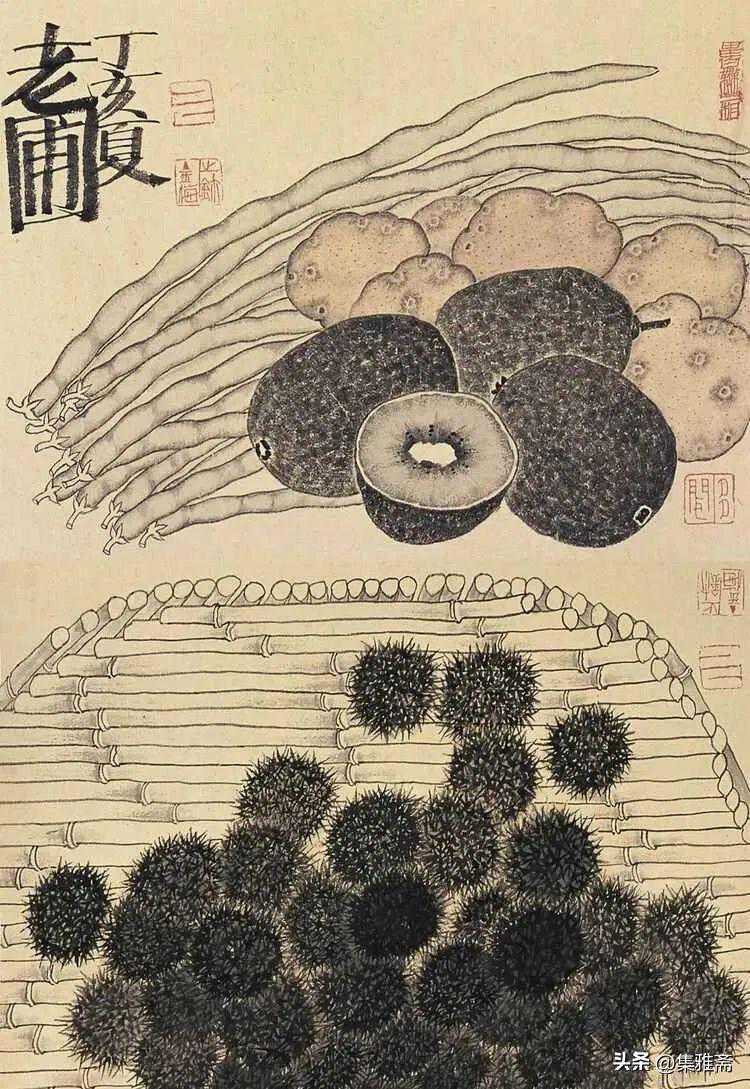 他也长于对物象的描绘和塑造。作品中各式田园物产的真实质感,加上形态上的夸张与变形,给观者带来了独特的视觉感受和丰富的精神内涵。尽管老圃的绘画仍隶属文人画中的折枝花卉一类,但他并没有过多地强调笔墨特征,始终保持着色泽的素雅与纯真,在绘画语言上与乡居生活中真挚、朴素的情感一一对应,塑造了一种平淡清逸的“写真”情怀。