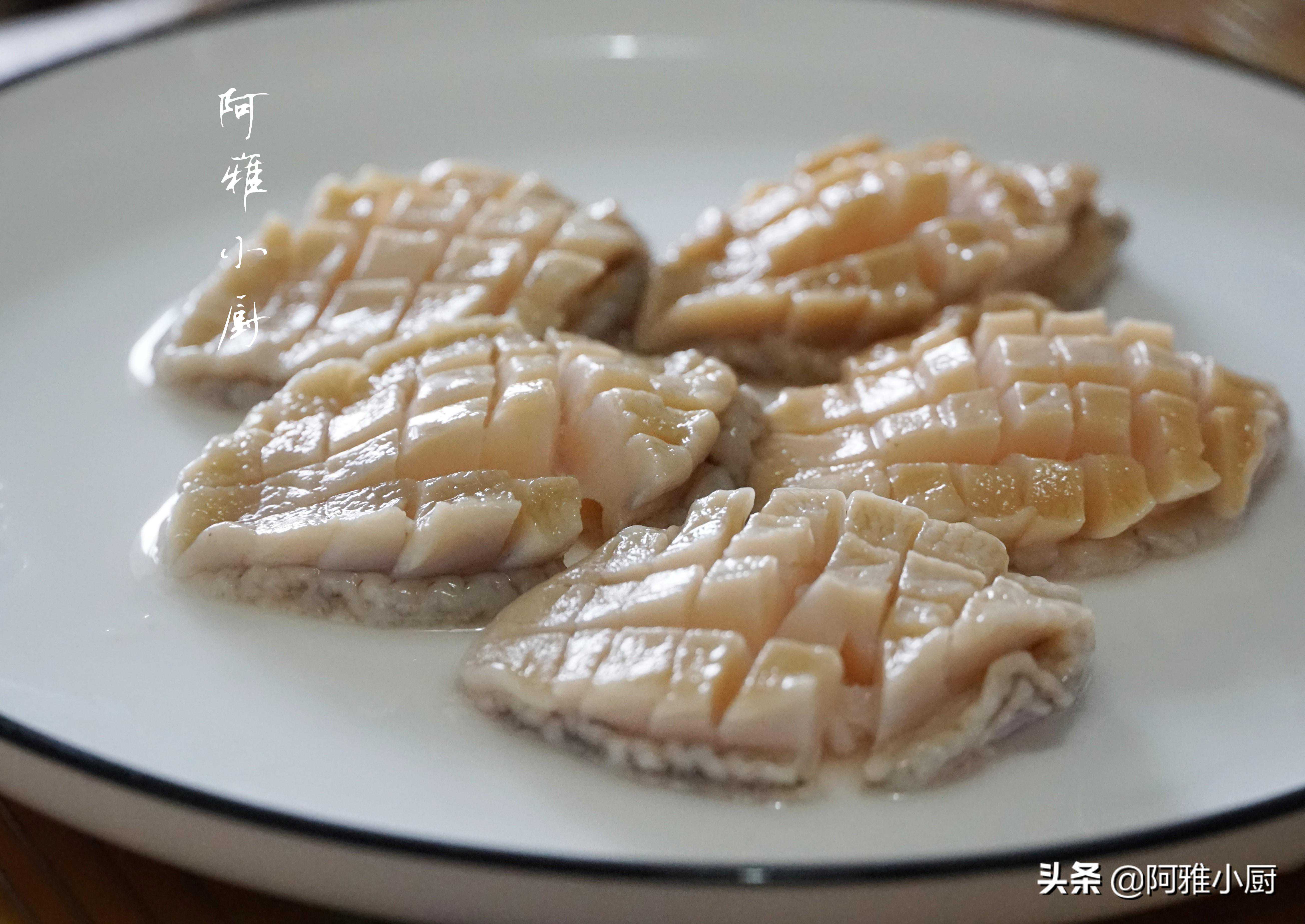 4.用刀在鲍鱼肉中打上花刀,这样鲍鱼容易入味,吃起来口感也更加软嫩。