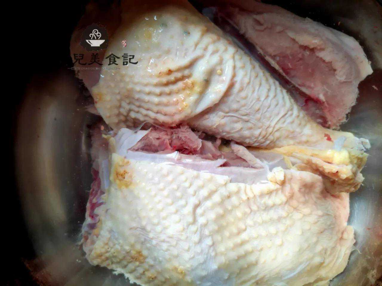 2、焯水捞出后的鸡肉,冷水下锅,水开后中小火煮20分钟左右,捞出放凉,这一步很多人喜欢开大火煮鸡肉,煮鸡肉火太大鸡肉收缩较大特别是鸡皮煮出来后不容易成型,口感也不好,第二点:中小火焖煮鸡肉,煮了鸡肉以后的汤汁先不要倒掉留下备用;