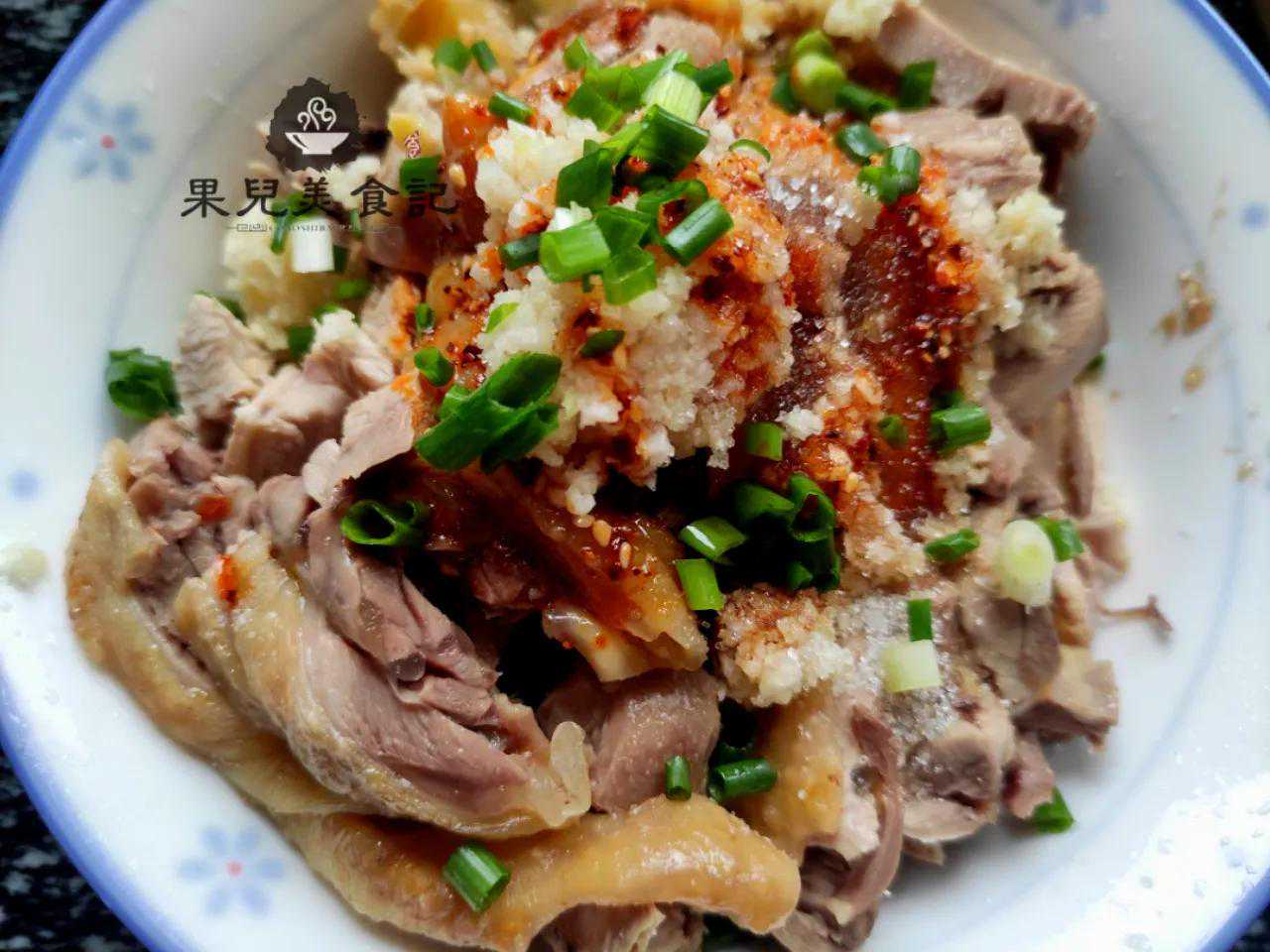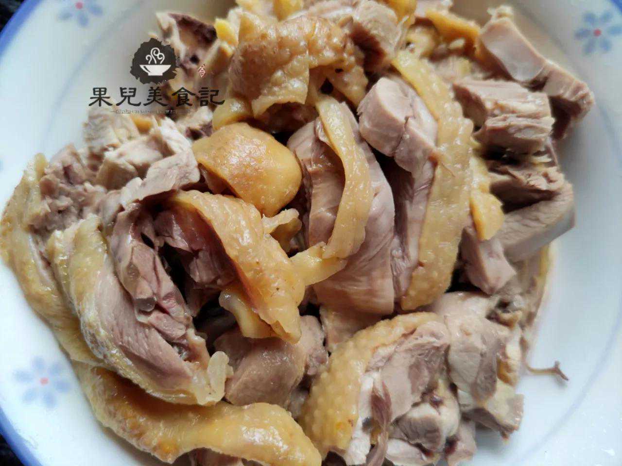 3、煮熟后的鸡肉捞出后,自然放凉再剁成小块,这一步有些朋友喜欢把煮熟后的鸡肉通过再过一道冷水降温,其实是不需要这么做的,让其自然降温剁块即可;