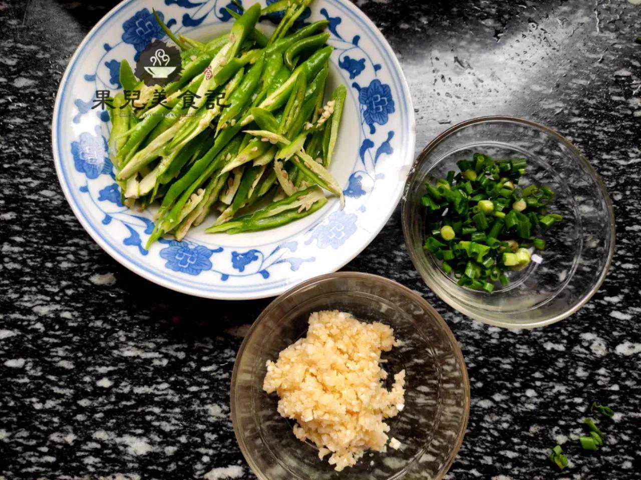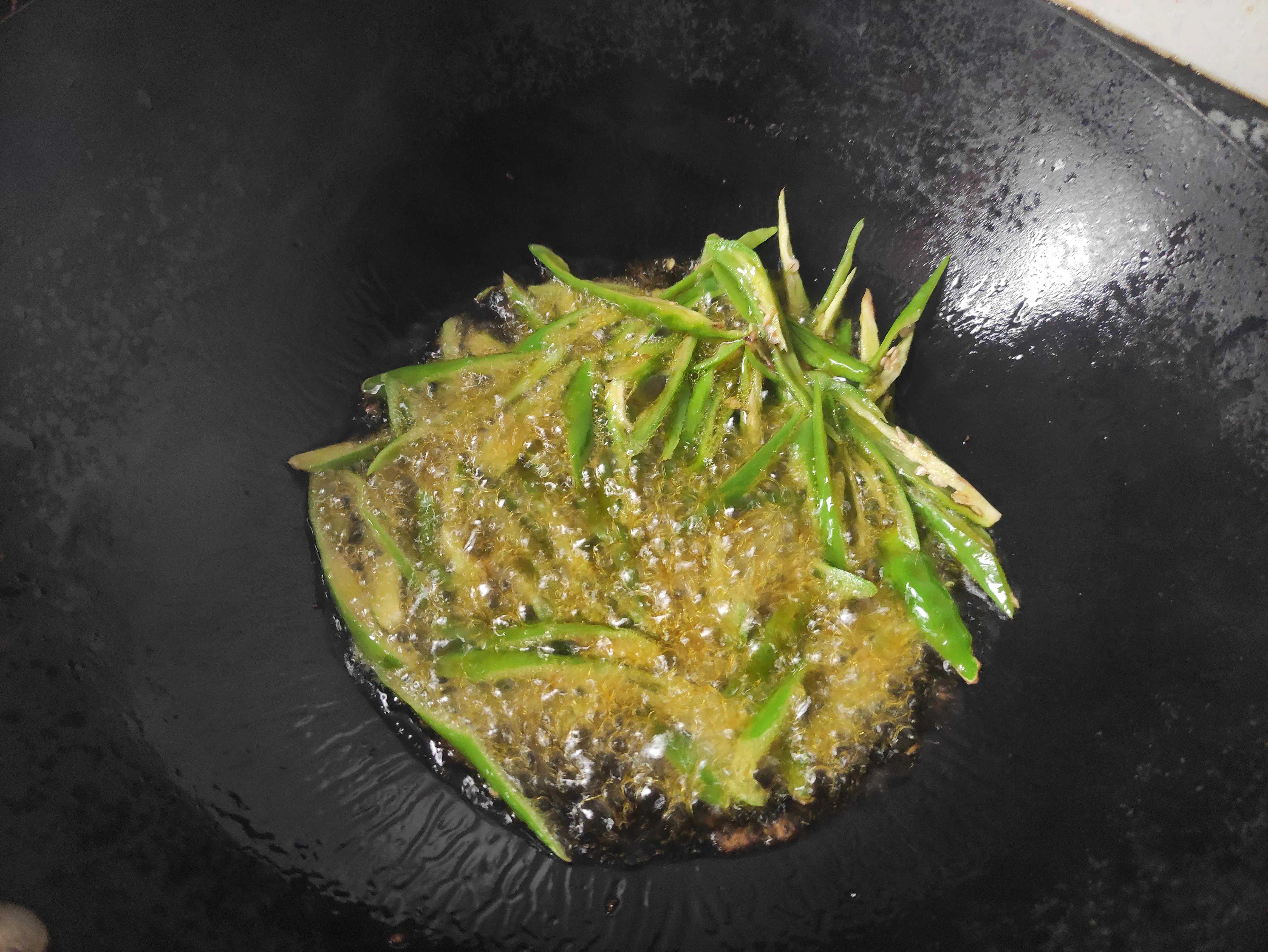 6、小时候大人凉拌鸡肉青辣椒喜欢用煤火烧来拌,特别好吃,现在没有煤火了,就把青辣椒放入加热的油温中快速爆炒至断生关火,放凉,在炒的过程中适量放一点盐;