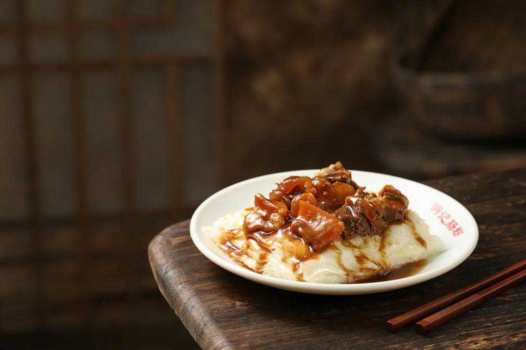 崩砂牛腩肠粉是店内的一大招牌,从牛腩选材烹饪到肠粉制作都极具匠心。大块腩肉双侧被筋膜夹着,在长时间的低温慢煮后,保持着筋膜的爽滑,肉质软糯甘香。