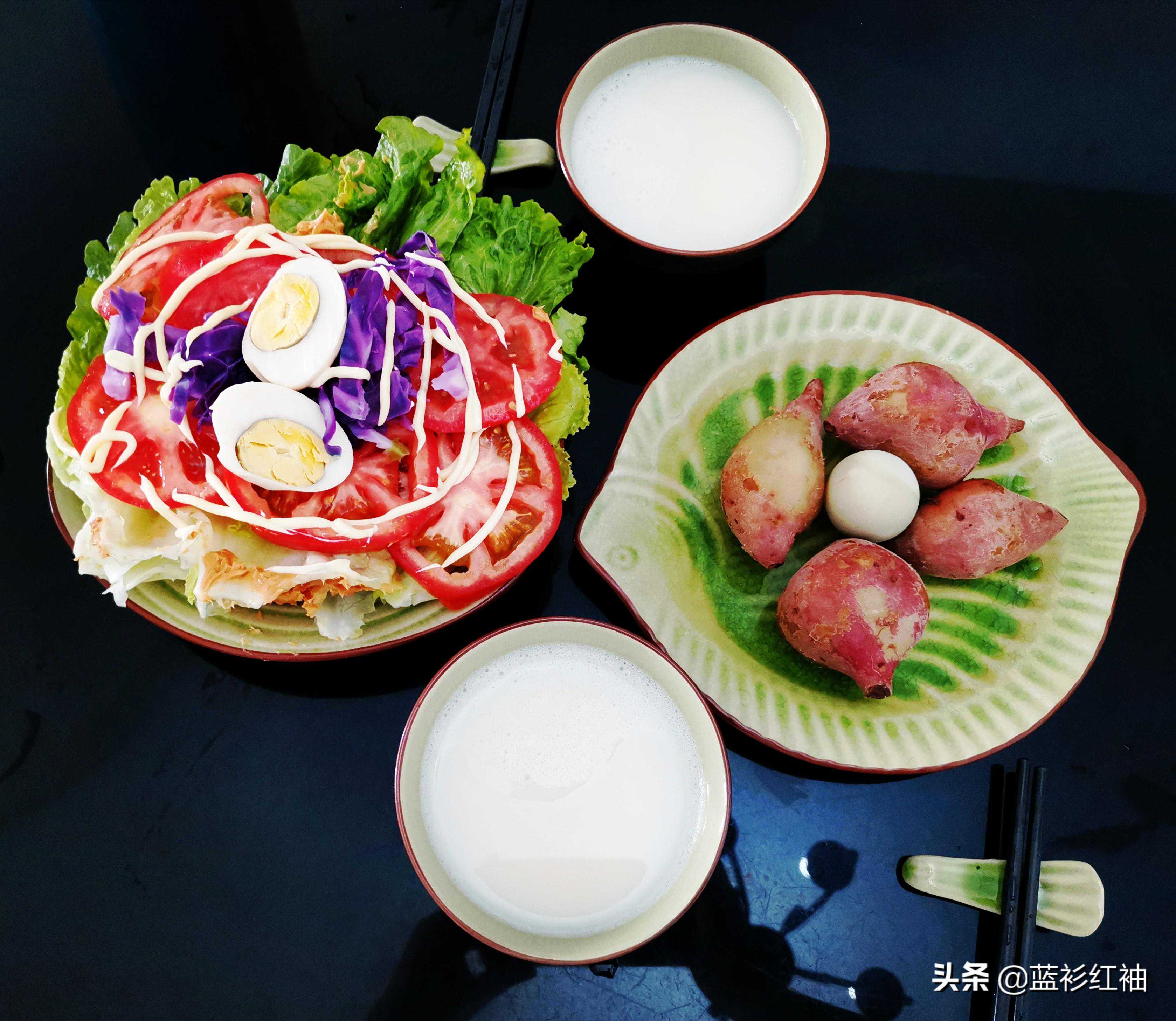 今天早上跑完步回来,还是做沙拉吃,主食是红薯。因为每天都有做运动,所以既要补充足够的维生素,也要适当补充一些蛋白质。所以另外还煮了两个鸡蛋。打了一杯口浆。豆浆是全自动豆浆机打的,没有技术含量,这里就不再说明了。