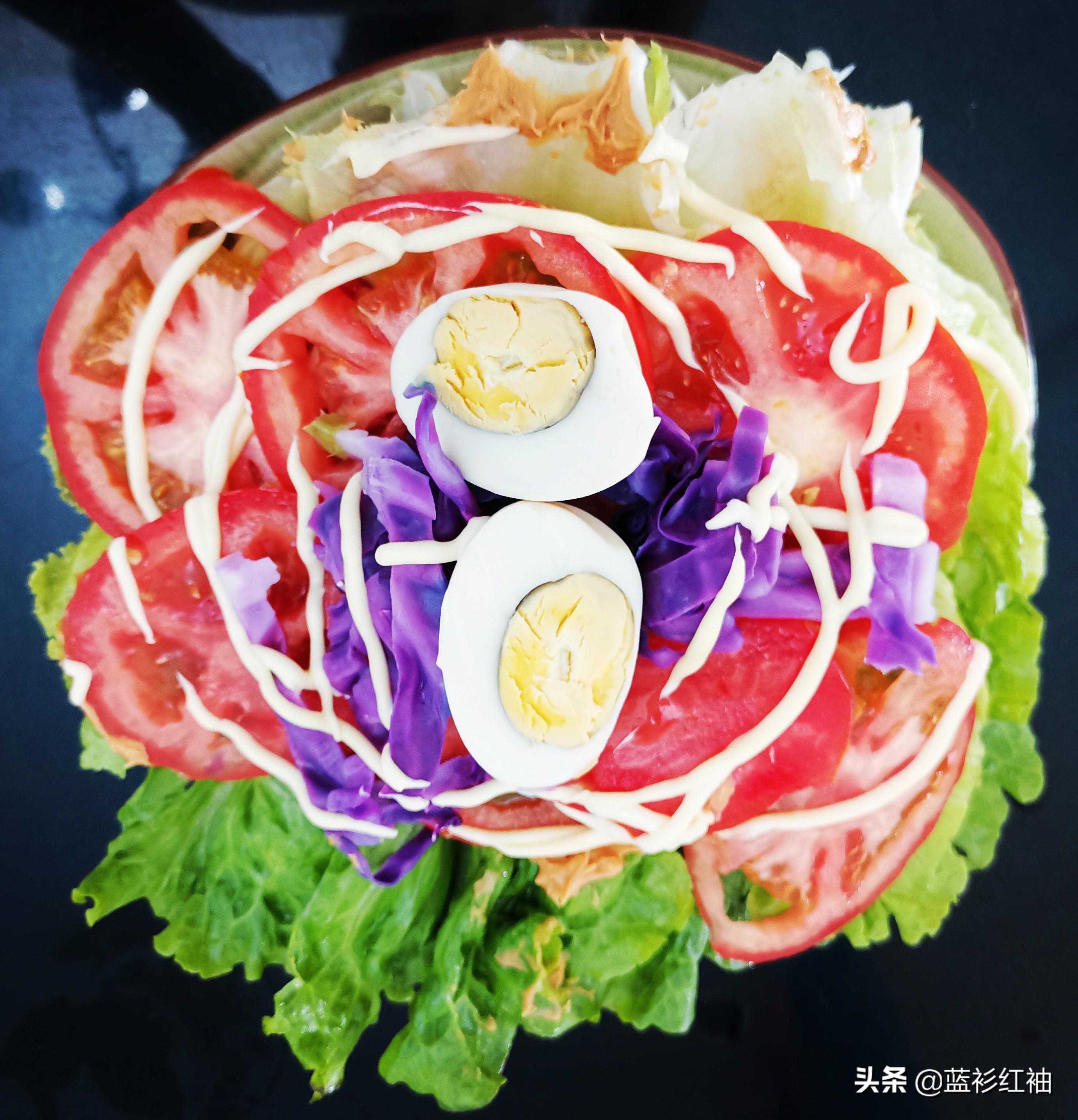 材料:生菜,西红柿,紫甘蓝,熟鸡蛋,沙拉酱,芝麻酱,做法:生菜,西红柿,紫甘蓝冼净,用淡盐水泡一下,最后用冰水浸一下,沥干水分备用,西红柿切片,紫甘蓝切丝,熟鸡蛋对片切开。然后把切好的食材一层一层码好,淋上适量的沙拉酱或芝麻酱。一份美味健康的五彩沙拉就出来,做法是不是很简单呢?
