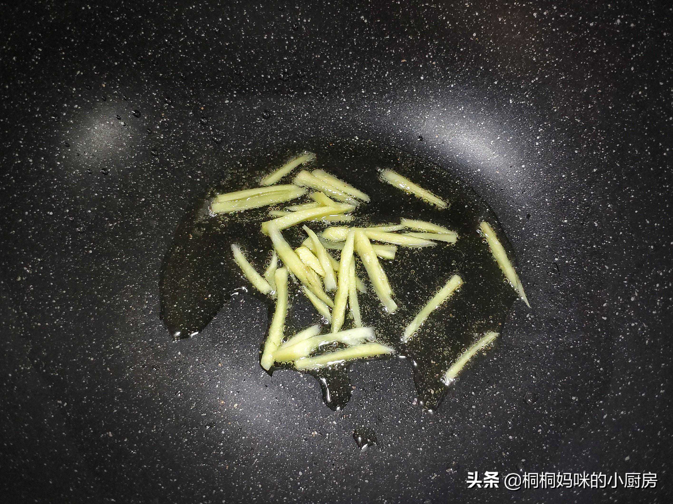 适量油爆香姜丝,倒入芥兰梗大火快速翻炒,炒到表面颜色变深就是基本断生了。