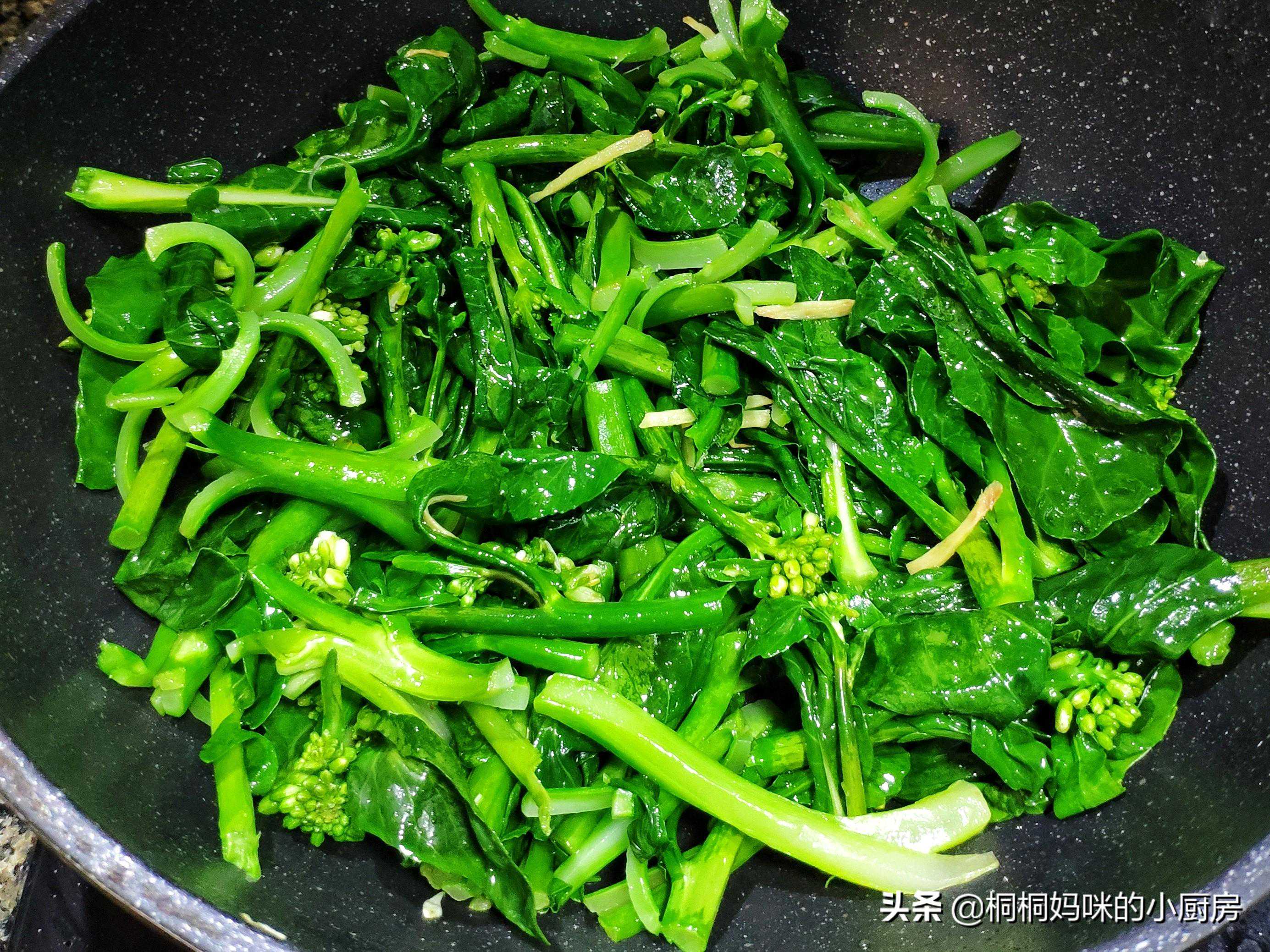 这时倒入芥兰叶子一同翻炒,保持大火一直翻炒到叶子变色变软。