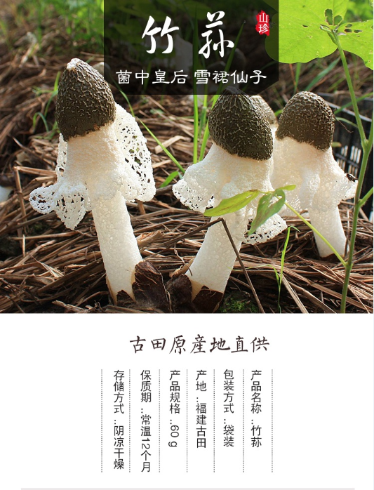 竹荪,又名竹笙、竹参、僧竺蕈,是一种名贵食用菌。竹荪是寄生在苦竹根部的一种隐花菌类,形状略似汽灯纱罩。它有深绿色的菌帽,雪白圆柱状的菌柄,粉红色的蛋形菌托,在菌柄顶端有一围细致洁白的网状裙,从菌盖向下铺开,整个菌体显得十分美丽,被人们称为真菌之花。竹荪含有丰富的蛋白质、脂肪、糖类等营养物质,菌肉色白,质嫩、散发清香。其荪肉滑嫩爽口,香气浓郁,味道鲜美,有“山珍之王”、“素菜之王”美称。
