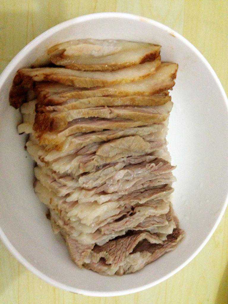 2、切成4毫米的大片,皮朝碗底整齐排列,加酱油,料酒,清汤,八角,桂皮、葱段、姜片上笼蒸透取出(旺火蒸1小时左右,时间长脂肪会分解,口感更好)。去掉八角、桂皮、葱段、姜片。