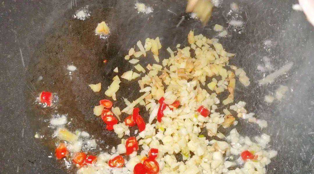 2.锅内烧油油热放入姜蒜,小米椒爆香。放入一勺老干妈翻炒均匀。