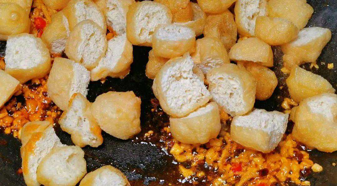 3.倒入事先切成两半的油豆腐,翻炒至上色均匀。再加入调好的酱汁,加入没过油豆腐的水。