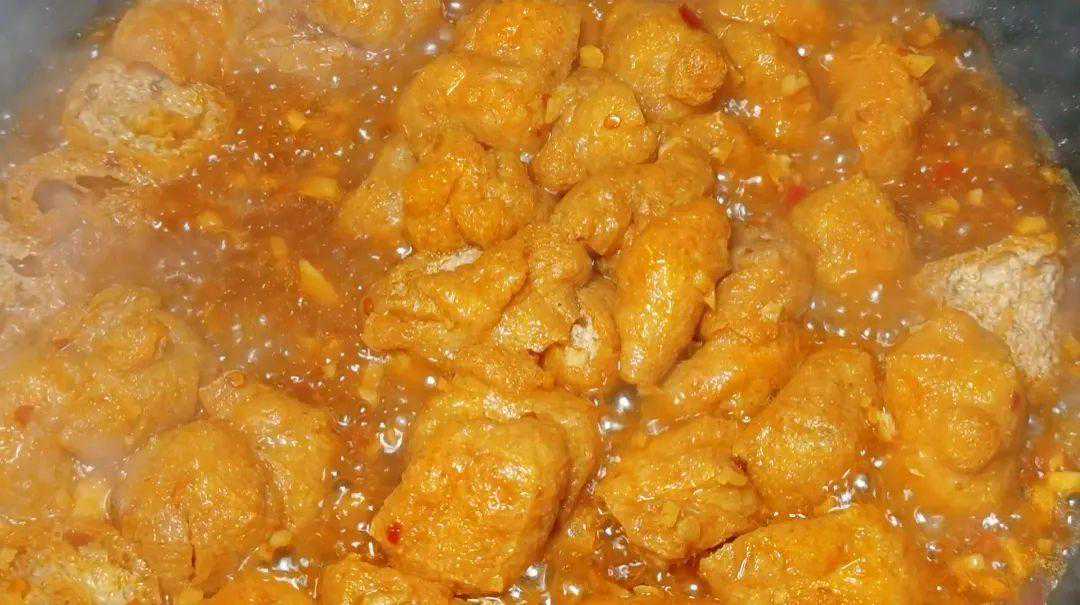 4.大概煮2到3分钟,油面筋充分吸收汤汁后,倒入事先调好的生粉水,翻炒均匀。
