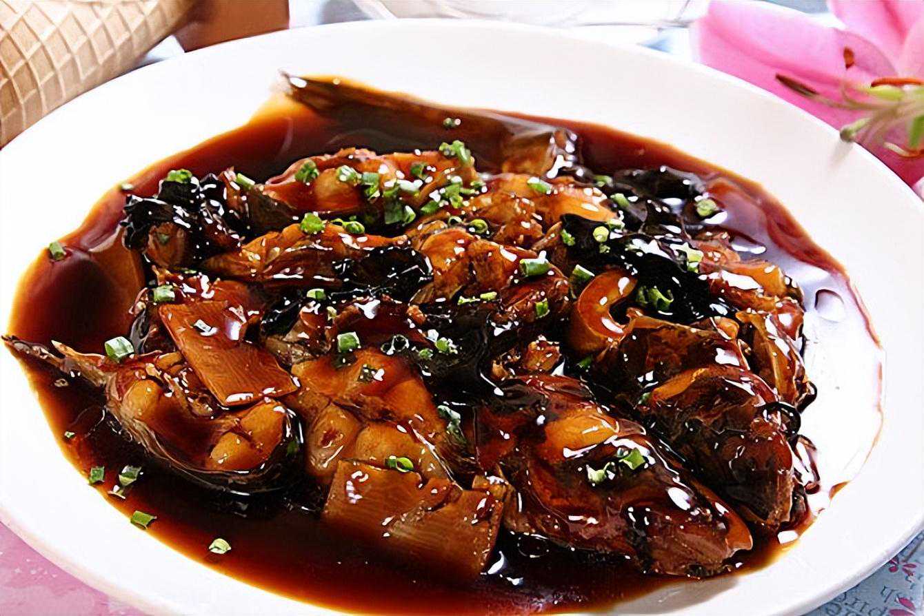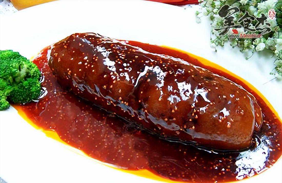 9.虾子大乌参:虾子大乌参是一道传统沪菜。烧制虾子乌参,首先要把火燎水发过的乌参用油氽,然后加黄酒、酱油、虾子、肉卤、高汤、白糖和其他调料入锅烧炖。成菜后乌光发亮,质软酥烂,鲜香汁浓。