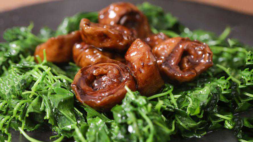 13.草头圈子:草头圈子是一道色香味俱全的名菜,属于沪菜系。此菜色泽深红间绿,圈子酥烂软熟,肥而不腻。在上海海派菜单里是一道非常受欢迎的美食,这道菜上海人现在是一年四季都能吃到的,要在以前只能在草头上市时才能吃上这道菜,草头是句上海土闲话,实际上它的学名叫作苜蓿。