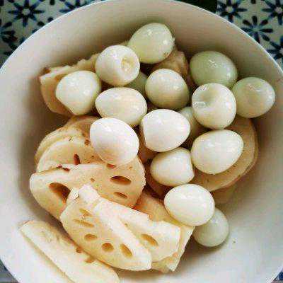 2、鹌鹑蛋煮好,剥皮,藕切片。