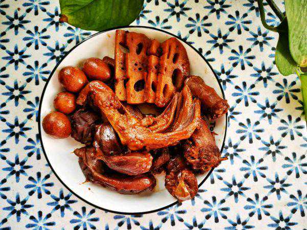 之前也做过鸭脖,这次配料不同,同时也增加了鸭掌、鸭胗、鹌鹑蛋和藕片。加豆干和腐竹估计也不错,我不吃豆制品,没加。这次配料只有少许辣,喜欢的可以加大辣椒的量。没有麻椒,味道不够完美。和之前方子比,更喜欢这个。
