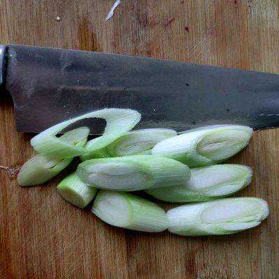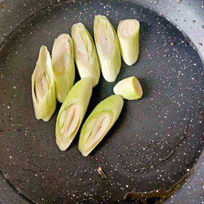 6、把煎好的葱扒拉到角落,煎一下牛肉片