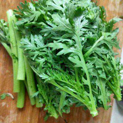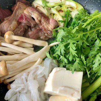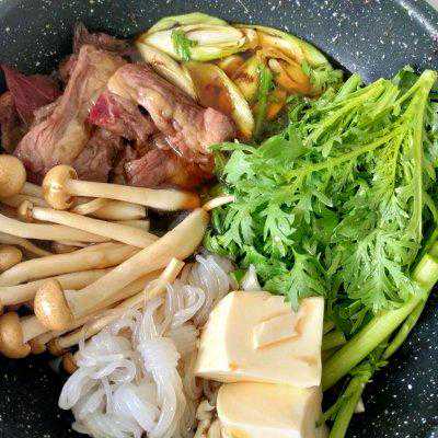 3、茼蒿切段,豆腐切大块,菇类魔芋丝清洗干净