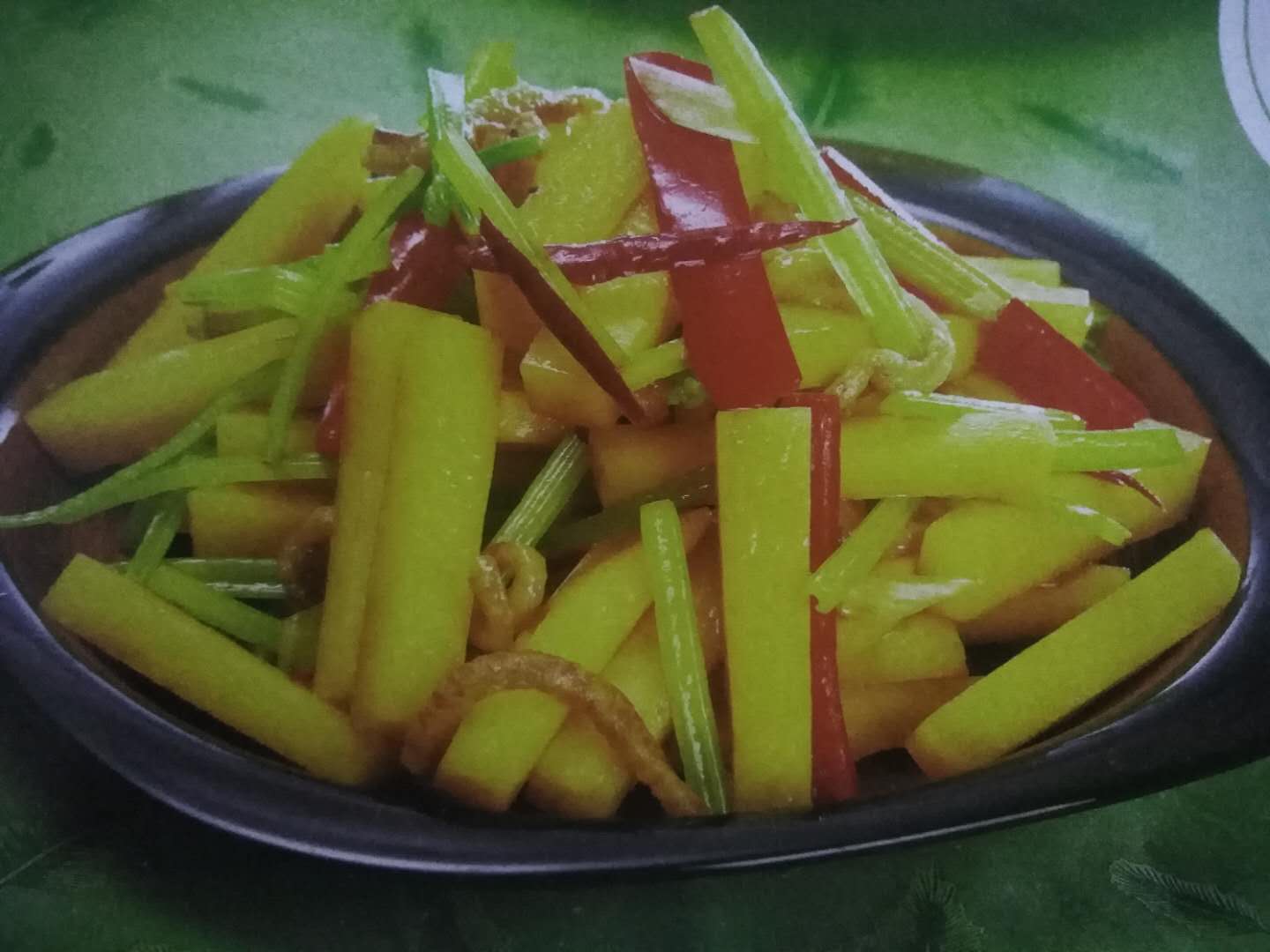 5下土豆条、加入酱油,小火炒至土豆条软,放入芹菜段炒熟。