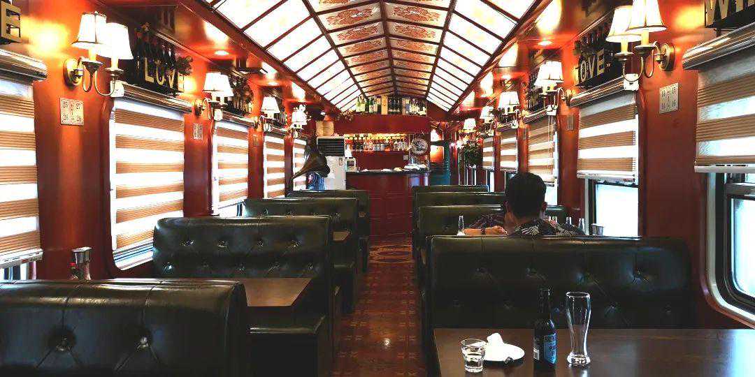 车内保留了火车车厢的所有主要元素,当然比绿皮火车要舒适漂亮许多。两侧临窗的四人餐桌,每张甚至还煞有介事地标了四个座位编号,看起来更像上个世纪欧洲豪华列车的餐车。餐厅有一个可以容纳8-10人的包间,平心而论里面冷气是更足一些,可是坐在散客区显然要有趣得多。