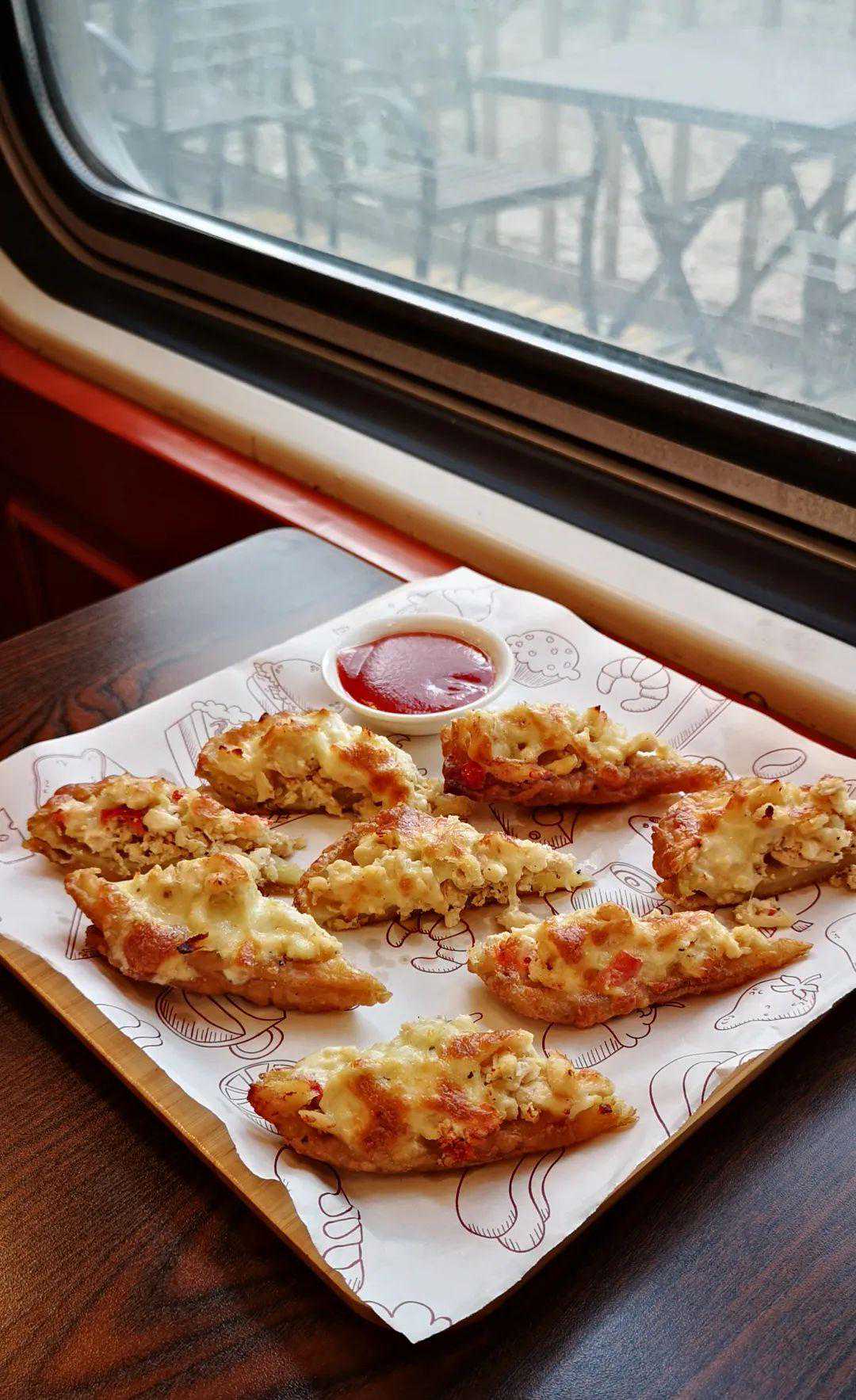 原以为烤薯皮是以薯角为基础的小吃,其实在土豆的胚子之外另有饼皮,而表面丰富的芝士鸡肉馅料,让实物尝起来有点像一块块mini披萨。端上桌赶紧趁热吃,外脆里嫩,味道很不错。