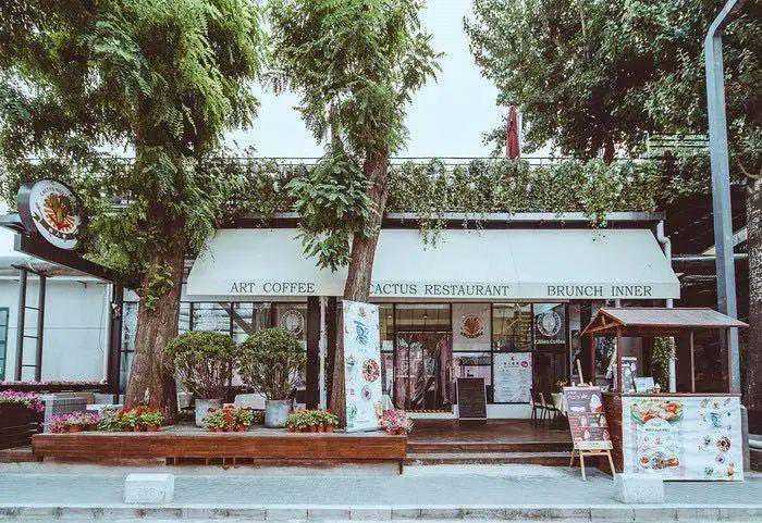 仙人掌餐吧在798艺术区的D区,798西街上,差不多是整个798的中心位置,与现代汽车文化中心隔街相望,离尤伦斯艺术商店也只有一箭之遥。门口绿树掩映下的白色欧式遮雨棚很有辨识度,棚下的木质地台也摆了几张桌子,能看到西街上的往来熙攘,又与马路保持了一个舒适距离,对于在艺术区逛到腿酸的人非常有吸引力。