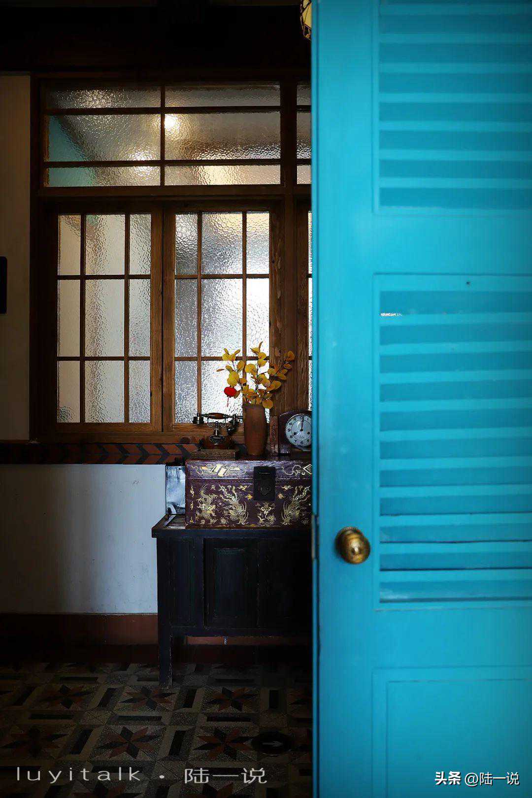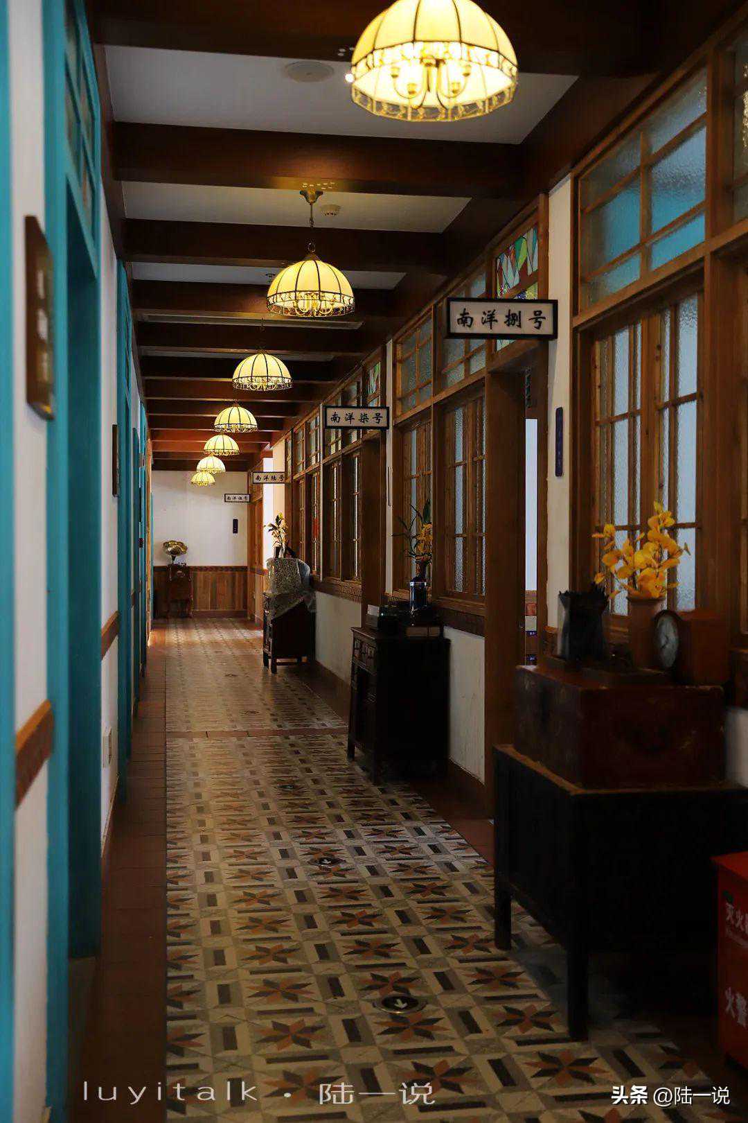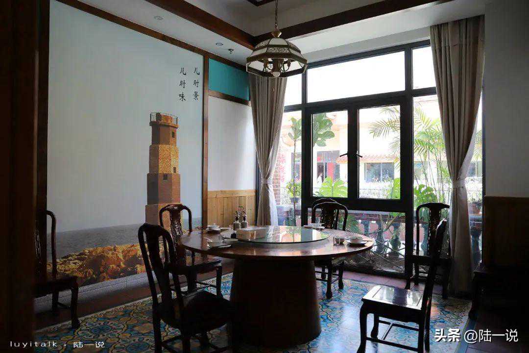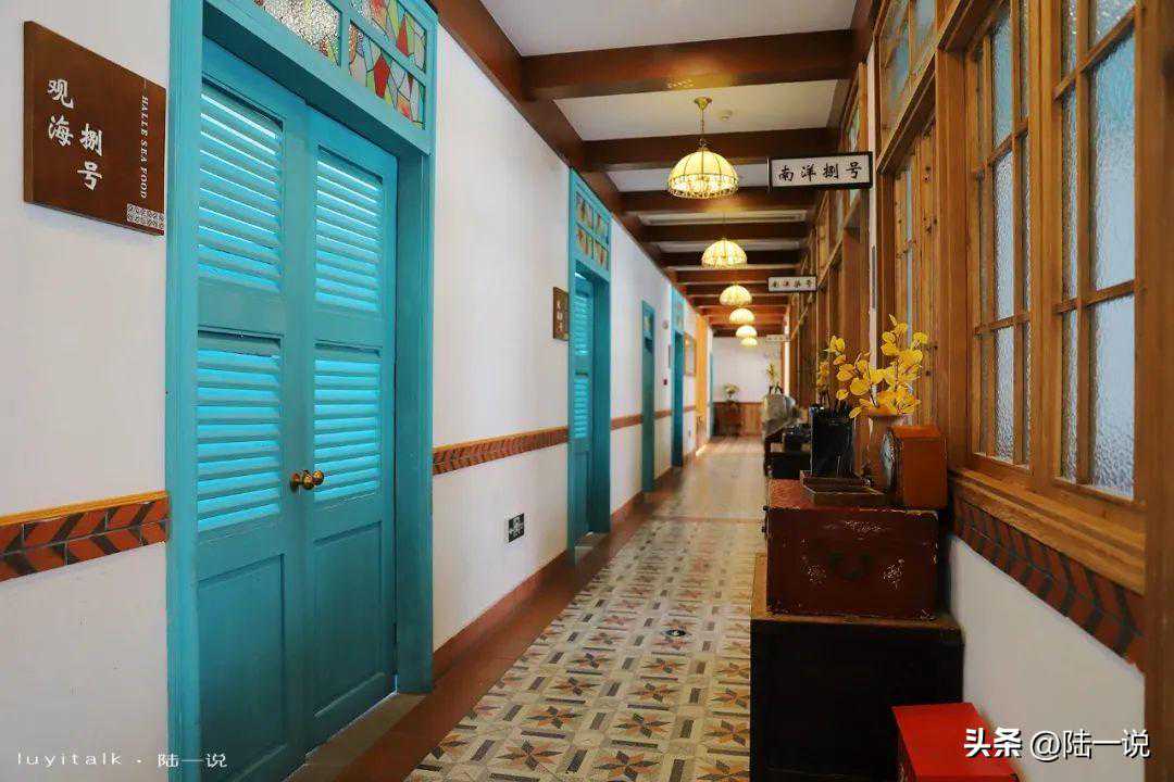 不过我最喜欢的还是南洋秘境,这里的包间大多可观海,我们定在观海玖号。穿过花砖、木窗、玻璃灯罩的长廊,蓝色门窗、鎏金的木行李箱、老式的电话机和唱片机从身边掠过,仿佛瞬移到中山路骑楼的楼梯间,被一种闽南特有的回忆拥抱。