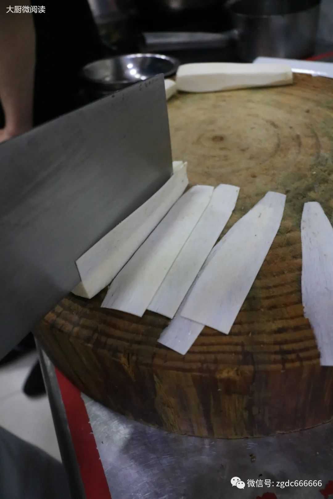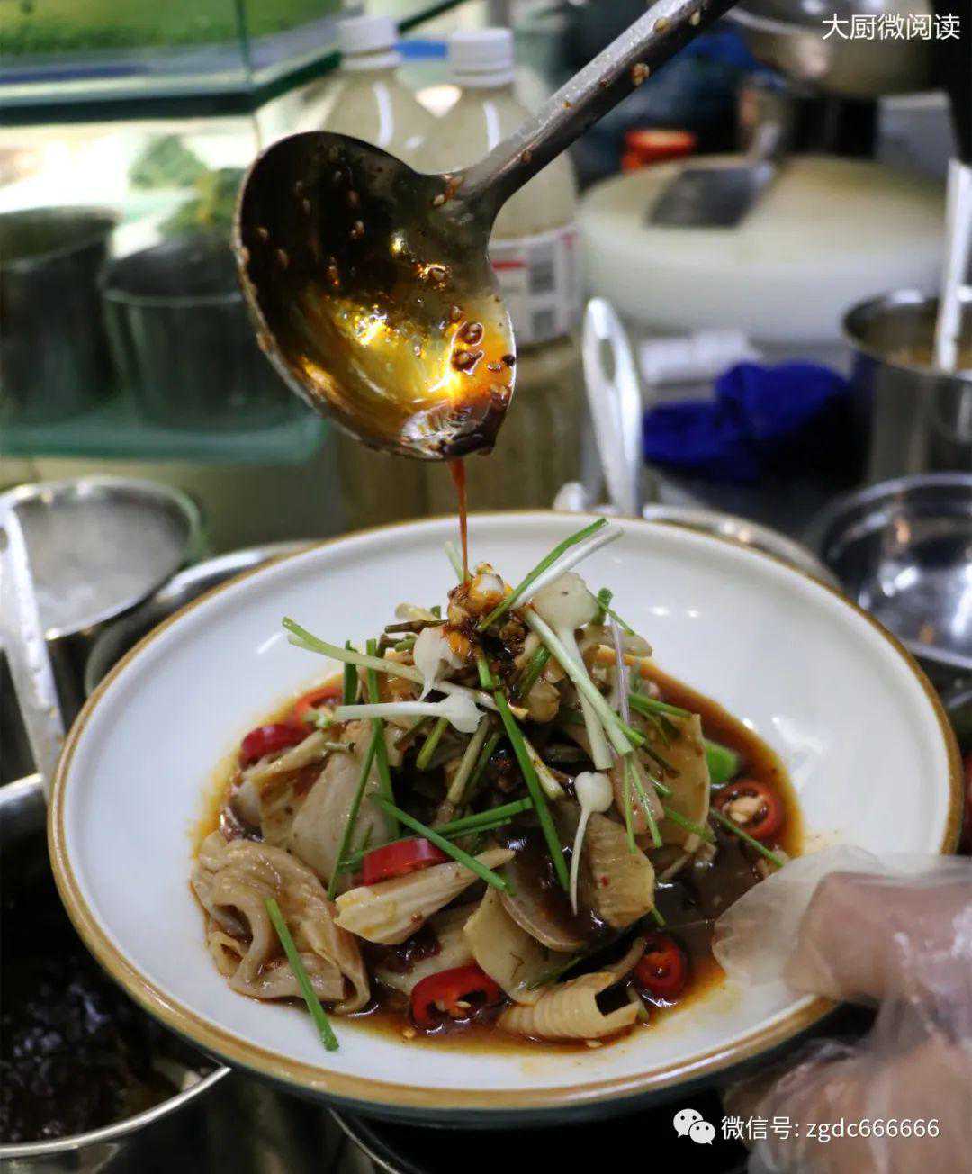 2.螺肉一定要生片,因为飞水时间短至3~5秒,只有薄厚均匀的螺肉片才能达到熟而不老的口感。