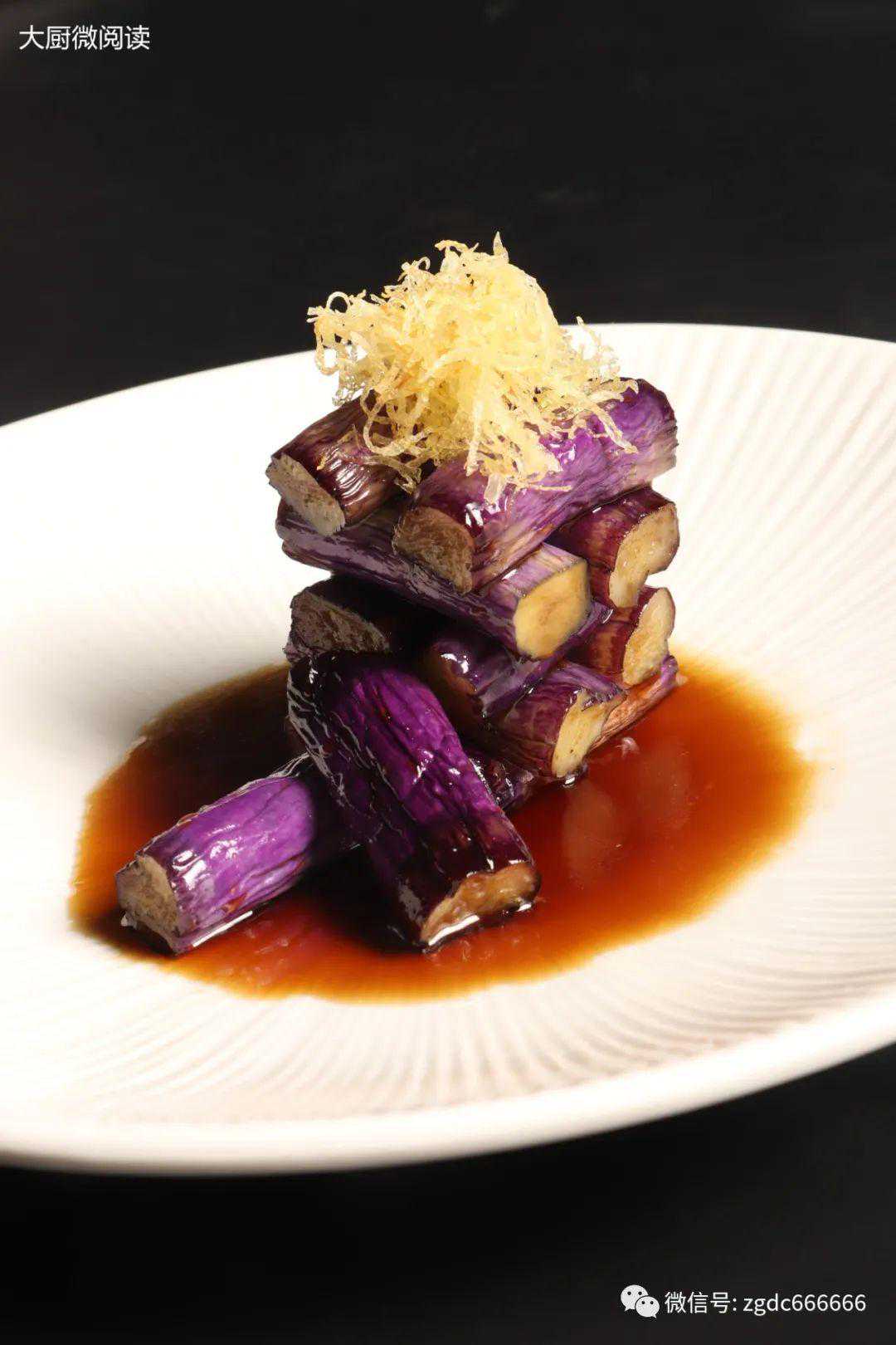“捞汁”通常用来做小海鲜,赵青将主料换为杭茄,先用热油炸至微皱,再趁热下入调好的捞汁浸泡,成菜水嫩咸香,十分清口。