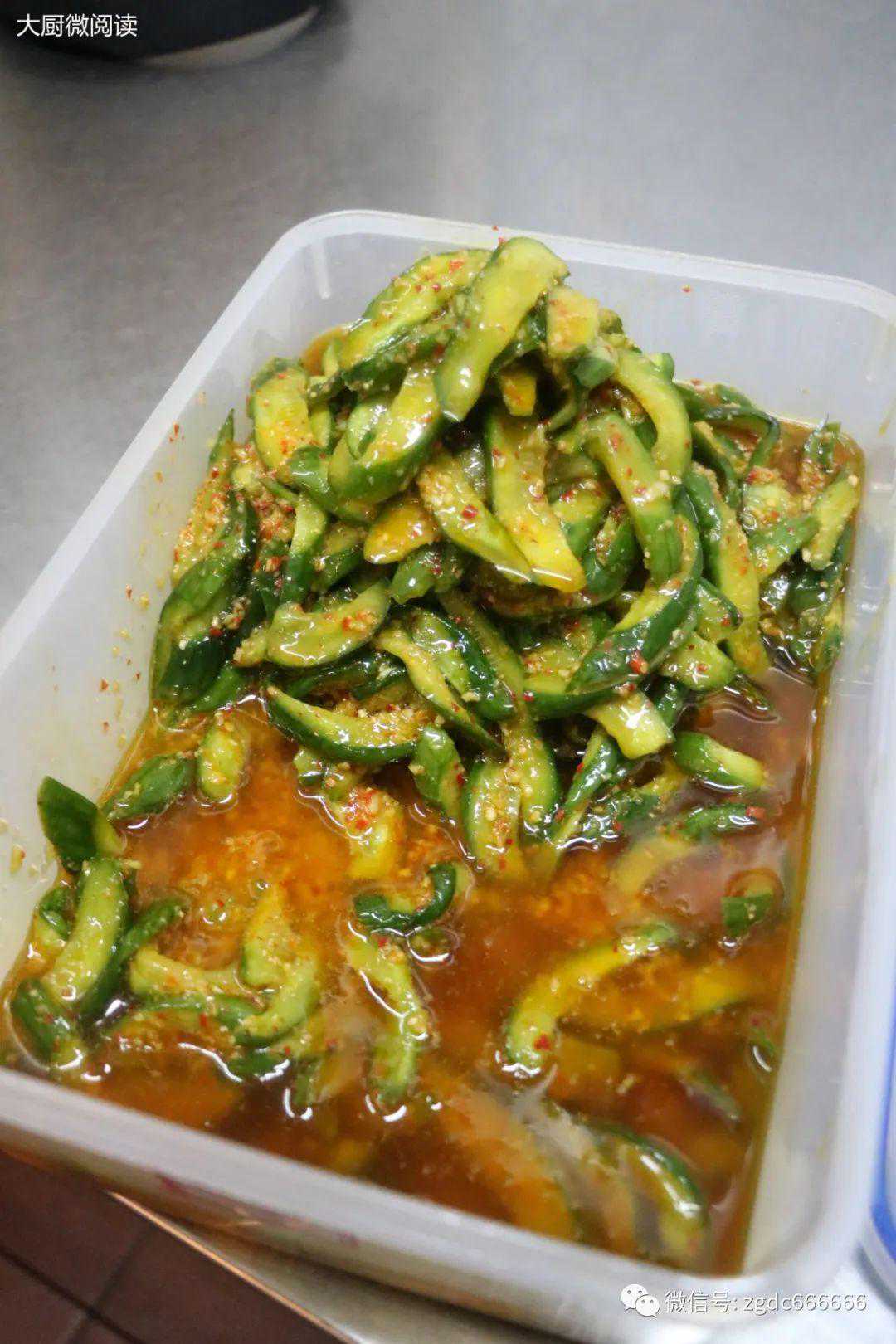 3.腌黄瓜:将黄瓜条放入泰式酸辣汁中腌制4小时。