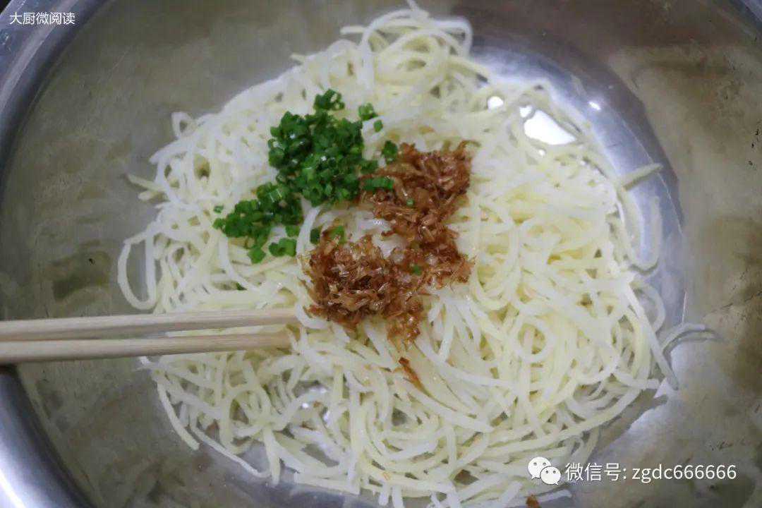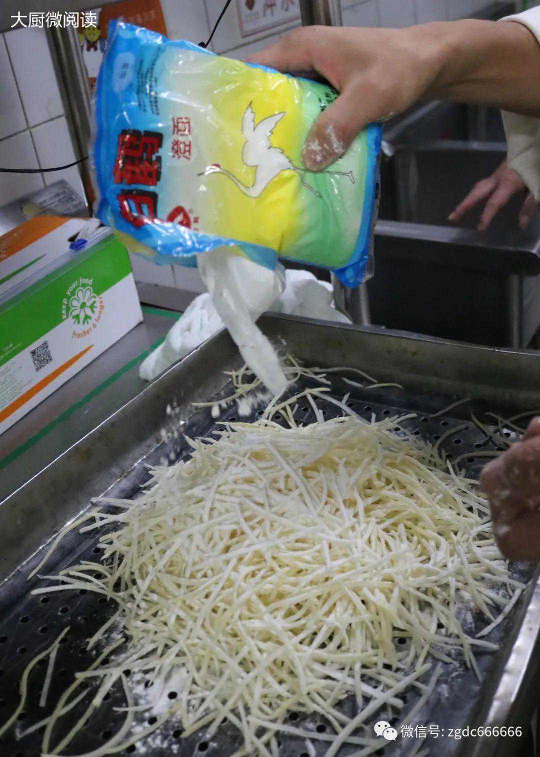 A:这就跟调肉馅要分次打水的道理相同。分两次添入澄面,通过蒸制,土豆丝能很好地将其吸收,成菜透亮不发黏,若是一次性拌入,口感较“厚”,且容易有生面味。