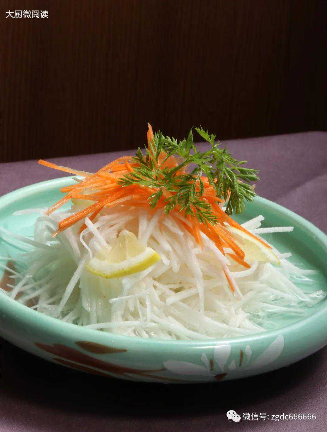 山药丝、胡萝卜丝直接入菜,加酸甜汁、柠檬调拌滋味,卖相清新,口感爽脆。