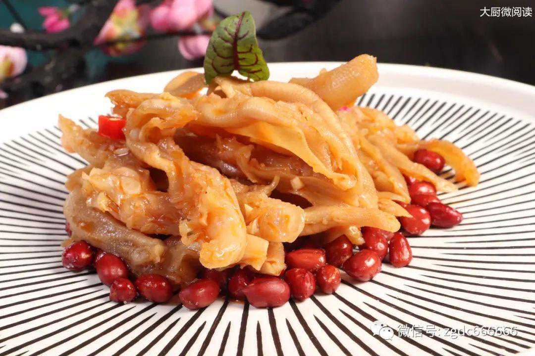 取油炸花生米100克垫入盘底,盖上泡好的椒麻无骨鸭掌150克,点缀花草即可走菜。