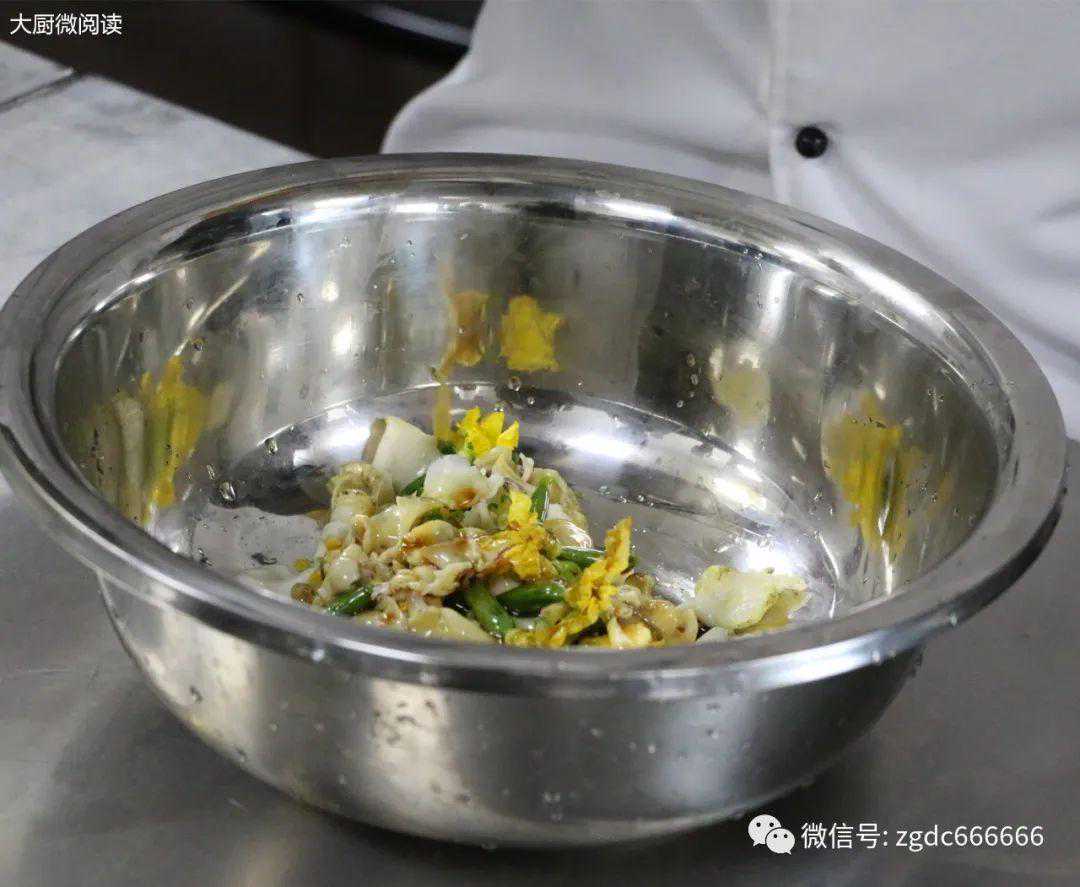 此菜中,原料无须放入酸甜汁中浸泡,否则酸味过浓,仅走菜前调拌便可充分入味。