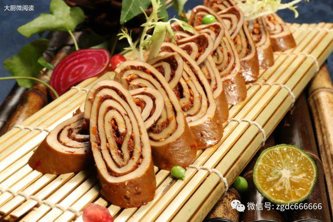 这道菜演变自“伤心凉粉”,原料变为更有嚼劲的五香豆皮,蒸透取出,趁热铺一层“伤心料”再腌制一天,豆皮卤香,馅料爽辣。