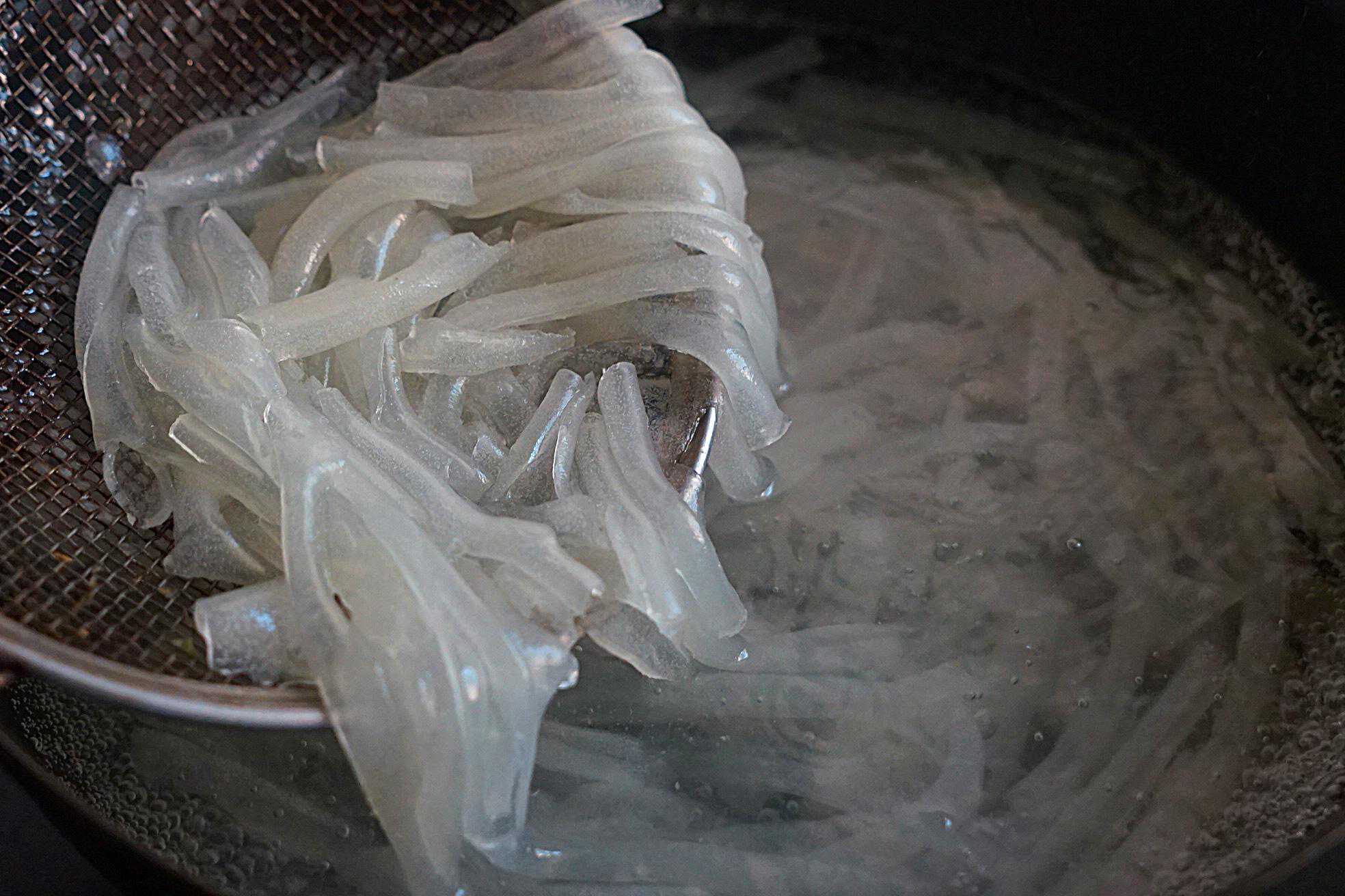 1、先准备好以上所有食材,然后将凉皮焯水后捞出来在凉开水里过一遍。这种凉皮是用豌豆粉做的凉皮,口感滑爽劲道,很适合用来做凉拌菜。
